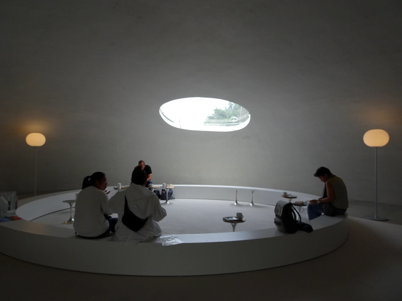 바깥에서 이미 보았듯 천장에는 커다란 구멍이 뚫려있는데 사람들은 대개 이 구멍 근처에 옹기종기 모여 앉거나 누워있다. 우리도 구멍 근처에 자리를 잡았다. 바닥에 엉덩이를 대고 앉으니 인위적인 콘크리트의 촉감이 무척이나 차다. 그 차가움에 익숙해지고 나니 그제야 천장의 구멍을 통해 하늘이 보이고 풀벌레 소리와 새 소리도 들린다. 여기에 가느란 리본과 실도 매달려있어 바람의 흐름을 눈으로 볼 수도 있다. 콘크리트로 만든 매우 인위적인 공간 안에서 도리어 "자연과 하나된다는 것"을 느낄 수 있다니, 역시나 묘한 기분이다.