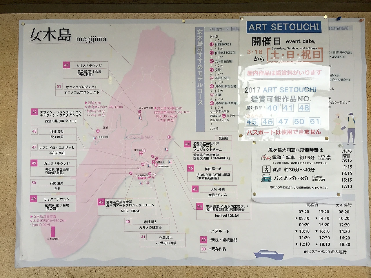- 섬 자체는 크지만 세토우치 예술제에 등록된 작품 위주로 돌아볼 것이라면 모두 도보로 가능(오니노코 기와 프로젝트 제외)하며 딱히 다른 교통 수단도 마련되어있지 않음