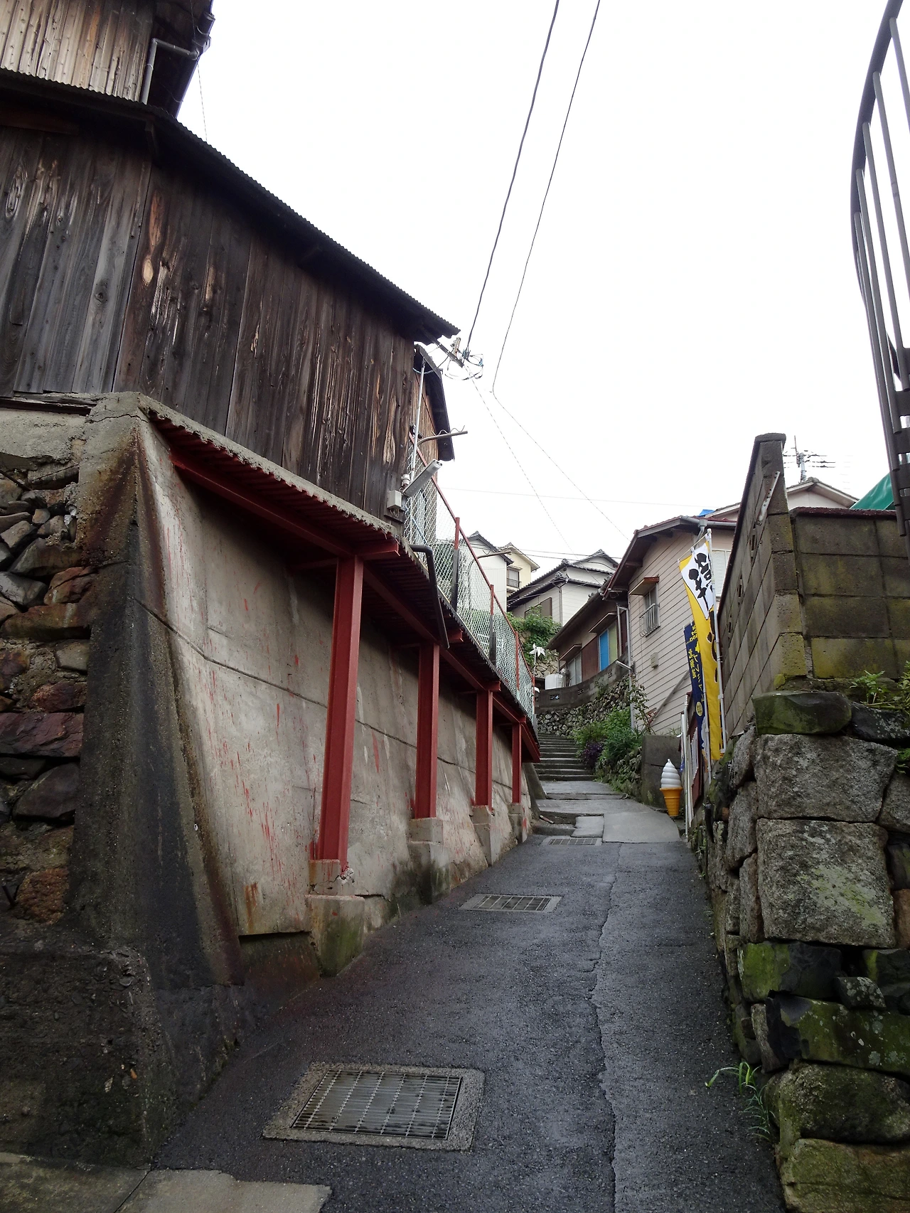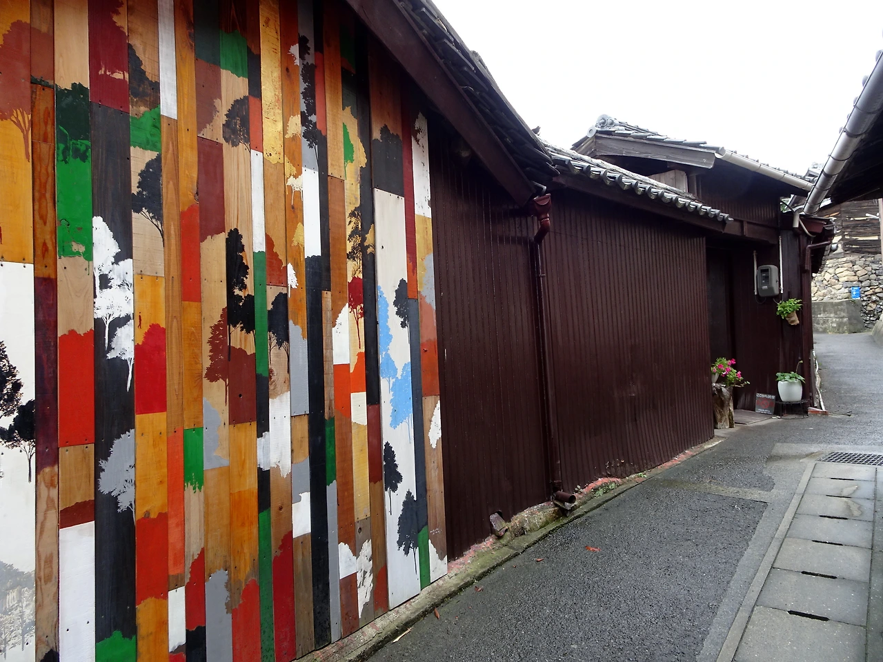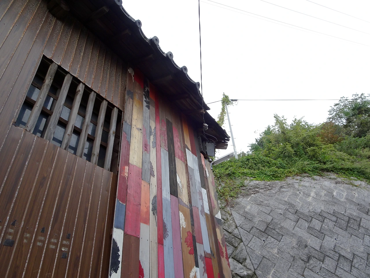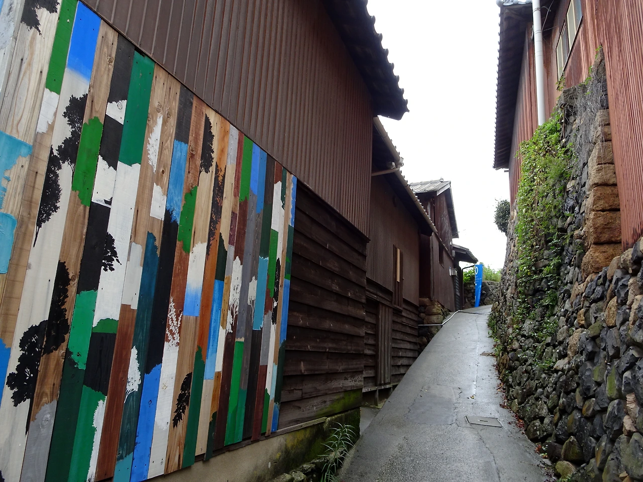 <오기지마의 혼>을 뒤로 하고 슬슬 마을 구경에 나서 본다. 오기지마는 평지보다 비탈이 훨씬 많아 절로 걸음이 느려지는 동네다. 게다가 좁은 골목들도 미로처럼 얽혀있는데 여기에 예술 작품들이 더해지면서 독특한 풍광을 자아낸다. 이런 풍광에 큰 역할을 하는 녀석은 바로 알록달록한 집들. 이 집들은 모두 <오기지마 골목 벽화 프로젝트 wallalley>로 불리는데 섬에서 모은 폐자재에 다채로운 색들을 칠해 집 외벽에 설치한 것이라고 한다. wallalley는 wall과 alley의 합성어로 간단하게 작품의 핵심을 담으면서도 두 단어의 둥글둥글한 발음도 유사하니, 꽤 잘 붙인 이름인 것 같다.