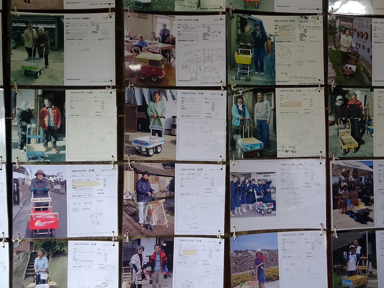 드디어 온바 구경이 가능해졌다. 사실 별 특별할 것은 없다. 실물 온바는 몇개 되지않는데다가 직접 끌어볼 수 있는 것도 아니니까. 하지만 한쪽 벽을 가득 메운 주민들의 사진이 눈길을 끈다. 주민들은 다들 자기 소유의 개성 있는 온바와 함께 사진을 찍었다. 모두 웃고 있는 모습이다. 내 작품이 누군가를 웃게할 수 있다니, 그런 것이야 말로 작가로서 느낄 수 있는 최대의 행복이 아닐까 싶다.