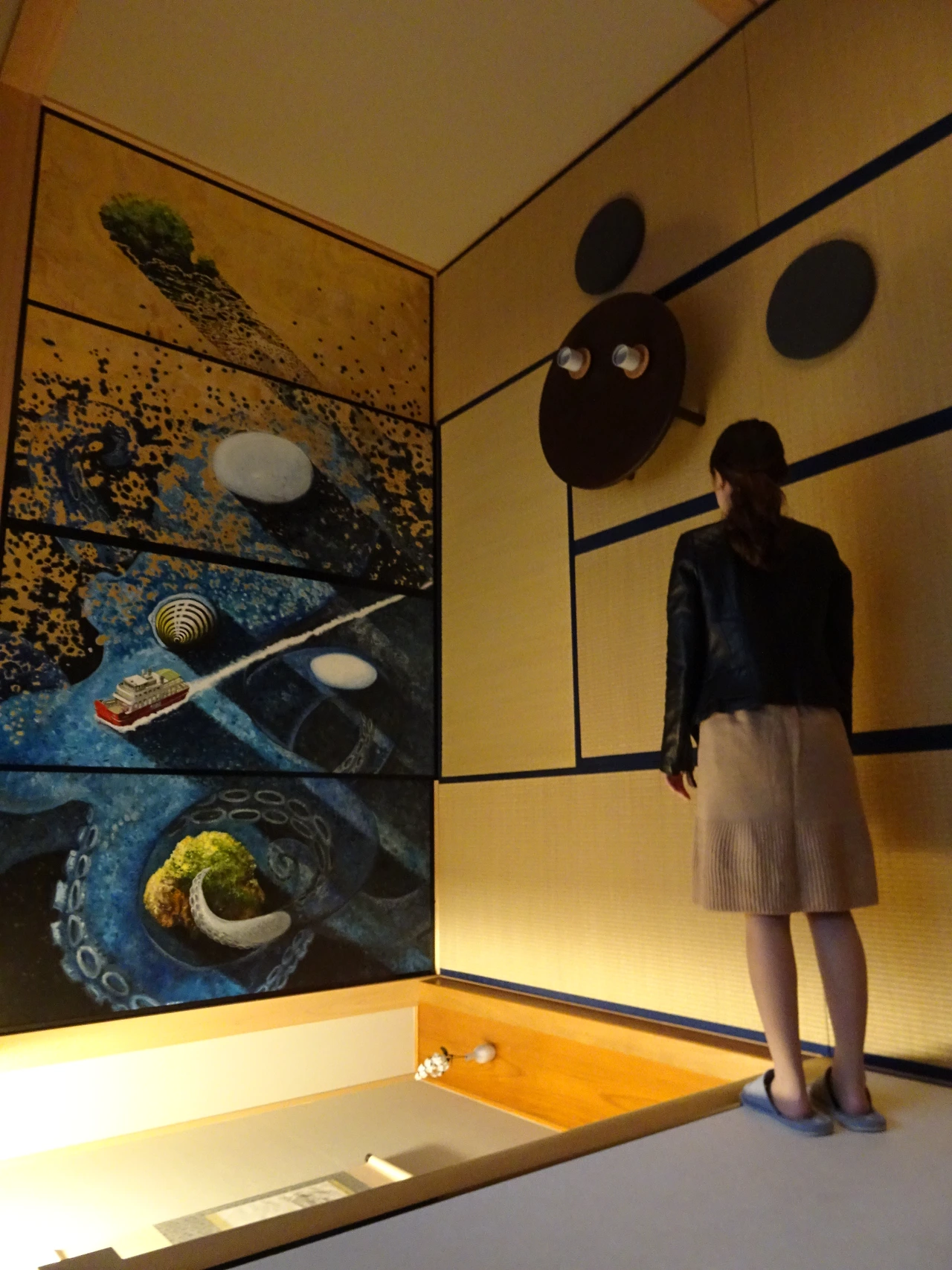 다음 작품은 <방 속의 방>. 얌전하고 평범해보이는 집으로 들어서면 완전히 뒤틀어진 다다미방을 만날 수 있다. 정확히는 어릴 적 가지고 놀던 인형의 집을 옆으로 돌려놓은 모양새다. 우리가 알던 바닥은 벽에, 벽은 바닥에 가있다. 이 상태대로라면 지금 내 발이 닿아있는 곳이 새로운 바닥이 되는걸까? 아니면 여전히 대나무 돗자리와 찻상이 놓여있는 곳을 바닥이라고 불러야 할까? 애당초 바닥이란 무엇이었을까 등을 고민하게 하는 작품이었다.