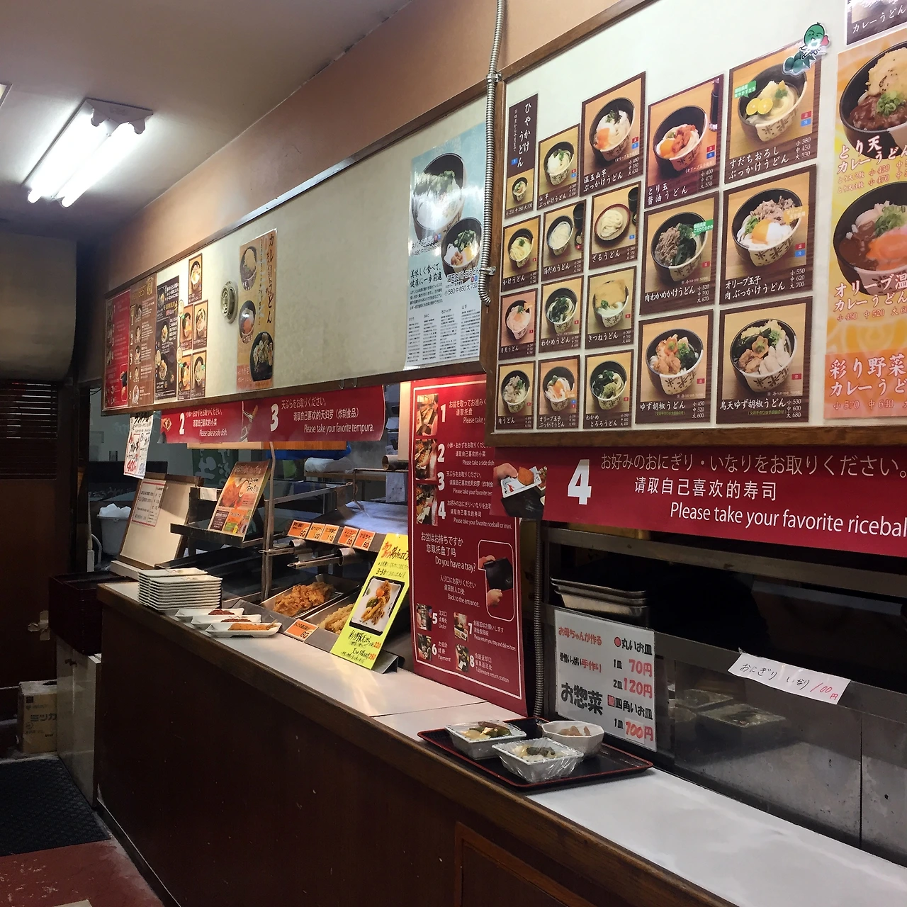 배식을 받듯 쟁반을 들고 순차적으로 이동하며 우동과 튀김류 등을 담은 뒤 한꺼번에 계산한다. 뒤에 사람이 주르륵 서있는 경우가 많아 오래 고민할 수 없다는 단점이 있으며, 눈 앞에 펼쳐진 튀김류의 비쥬얼에 홀려 이것저것 충동적으로 담게 될 수 있으므로 주의해야 한다. 먹은 뒤 식기들을 퇴식구에 가져다 줘야 하는 곳들도 있으니 잘 살펴보자.