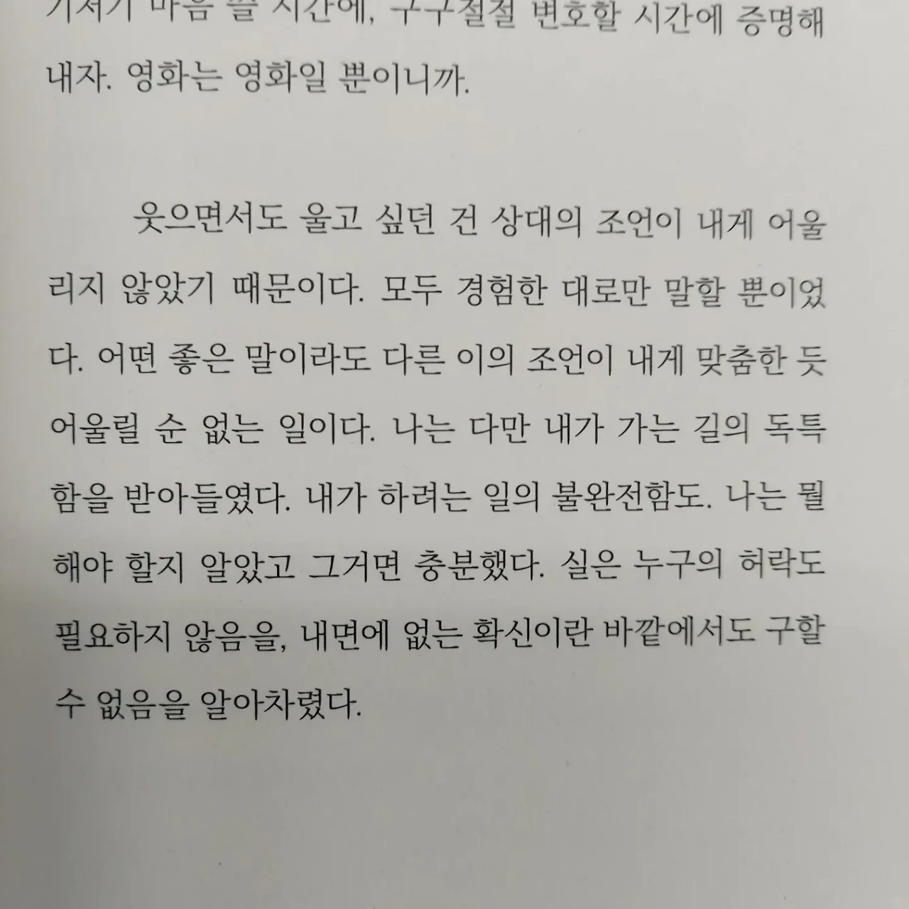 나는 내가 뭘 해야 할지 알았고 그거면 충분했다. 실은 누구의 허락도 필요하지 않음을, 내면에 없는 확신이란 바깥에서도 구할 수 없음을 알아차렸다.