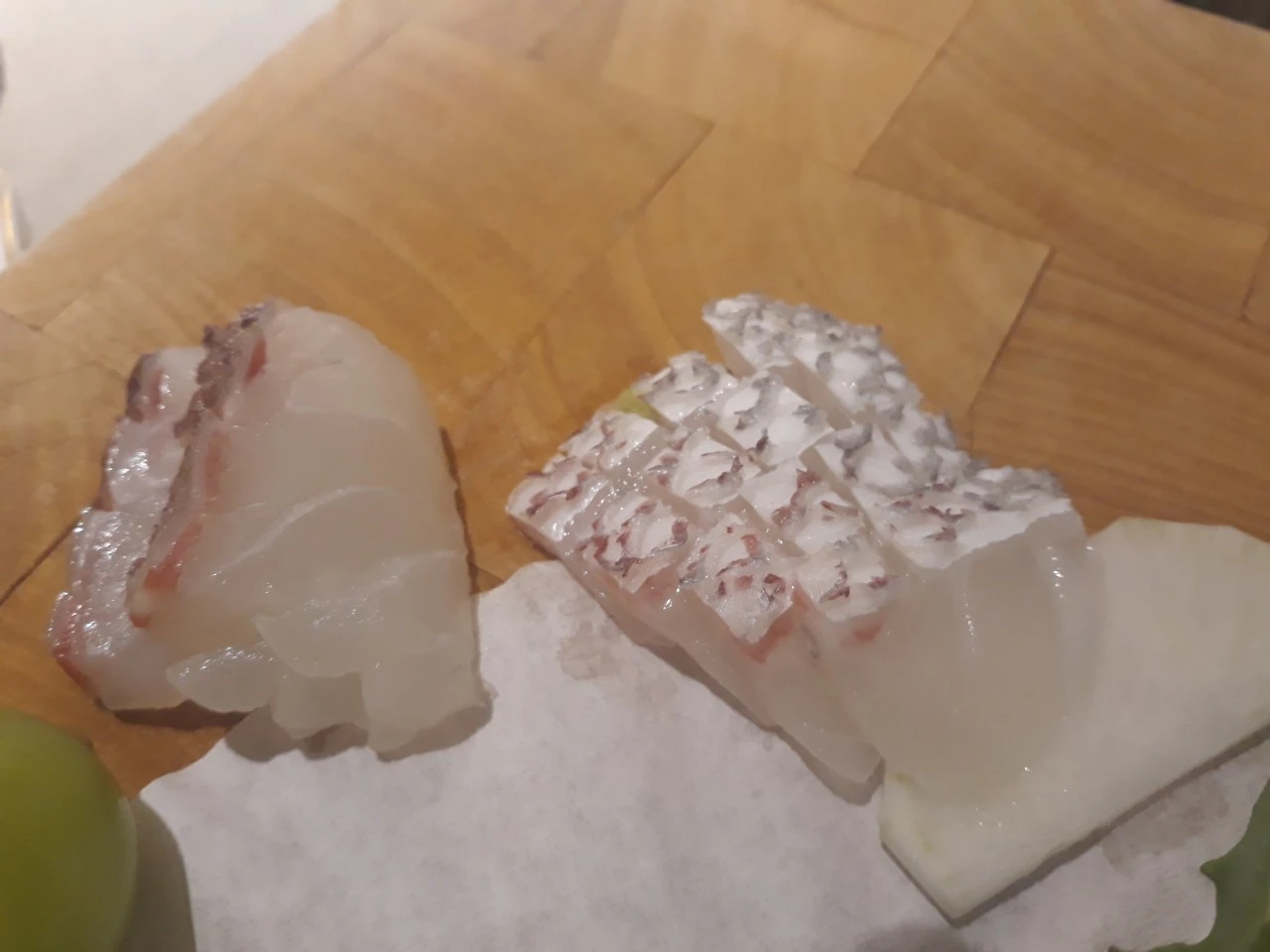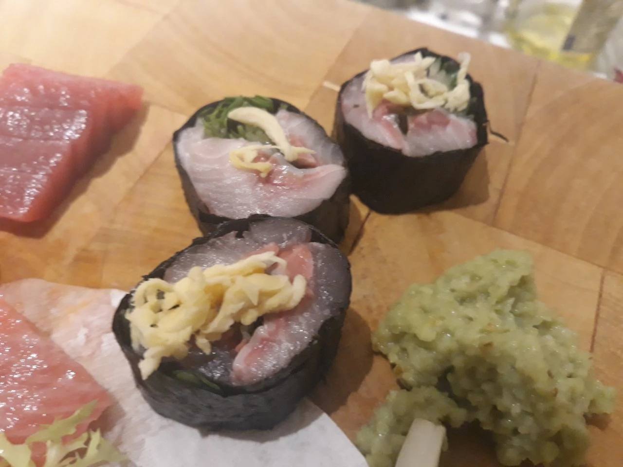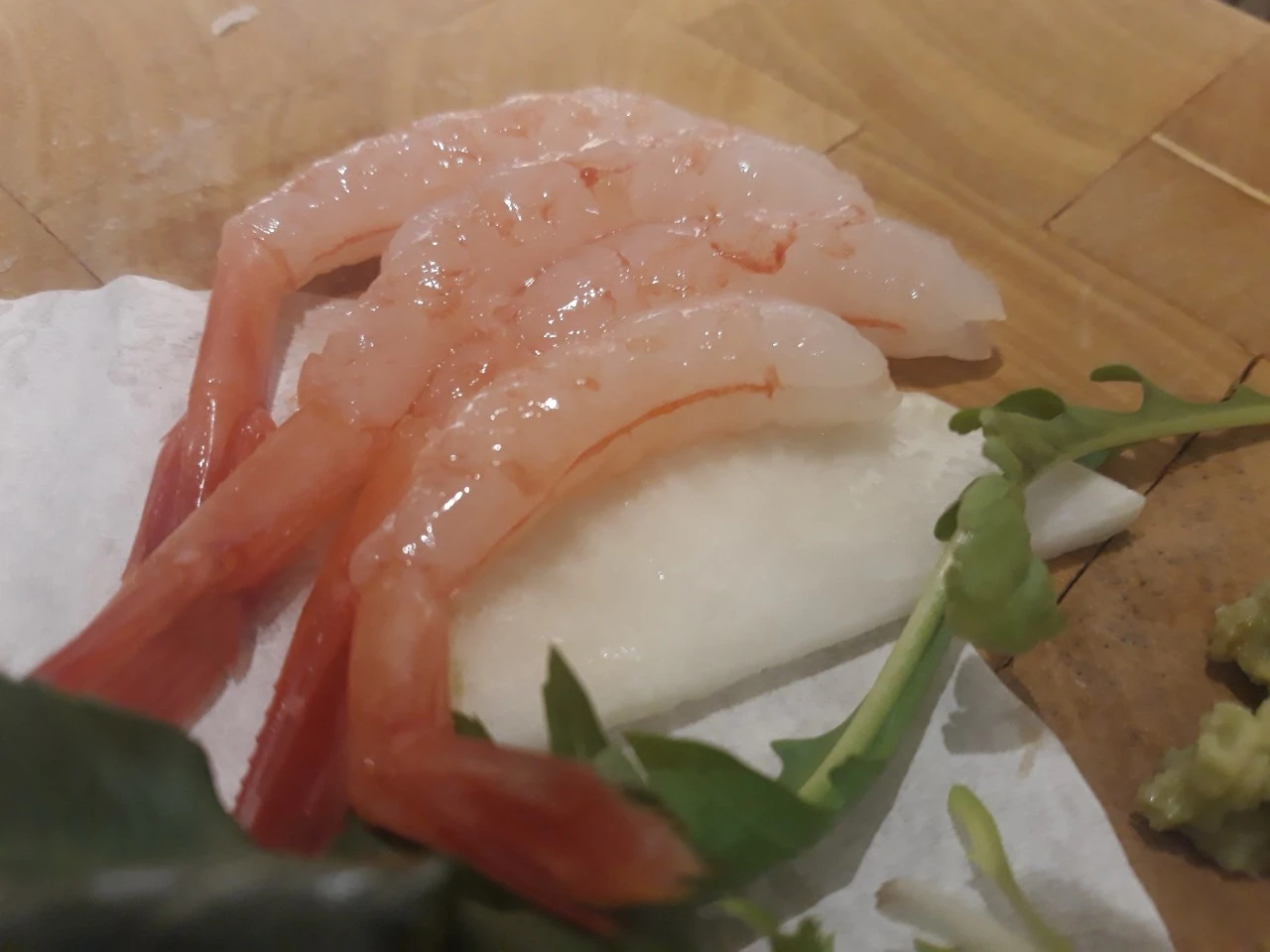 고급 장봉이 야채들과 걑이 아주 얇게 썰어져 나오고 도미는 할라피뇨 고추와 같이 나오며 참기름에 찍어 먹어 보라는 듯 바깔라오(스페인 대구 절임). 특별한 맛의 단새우 일본오징어 젓갈. 차조기. 버라이어티 한 전식이었다.