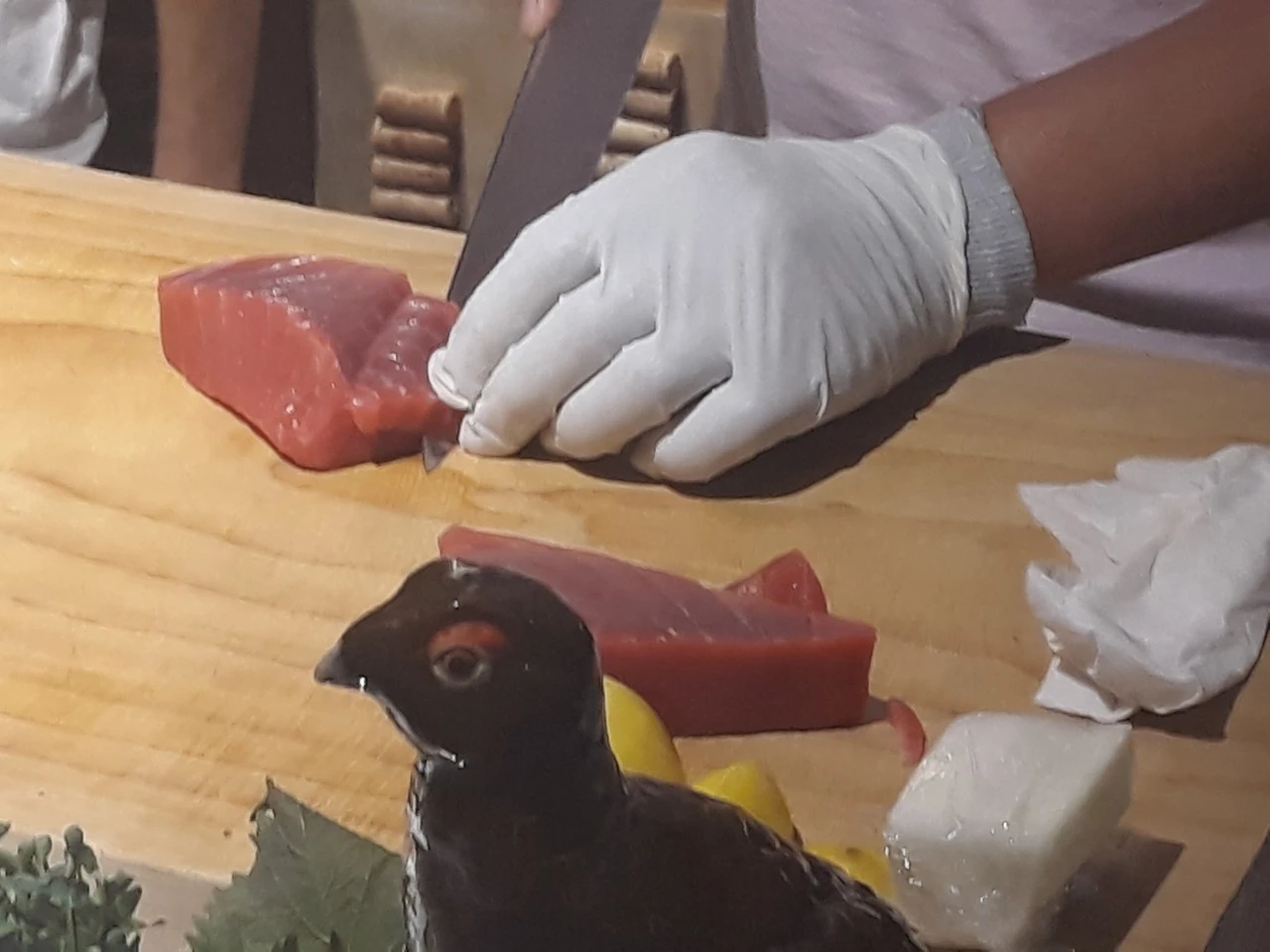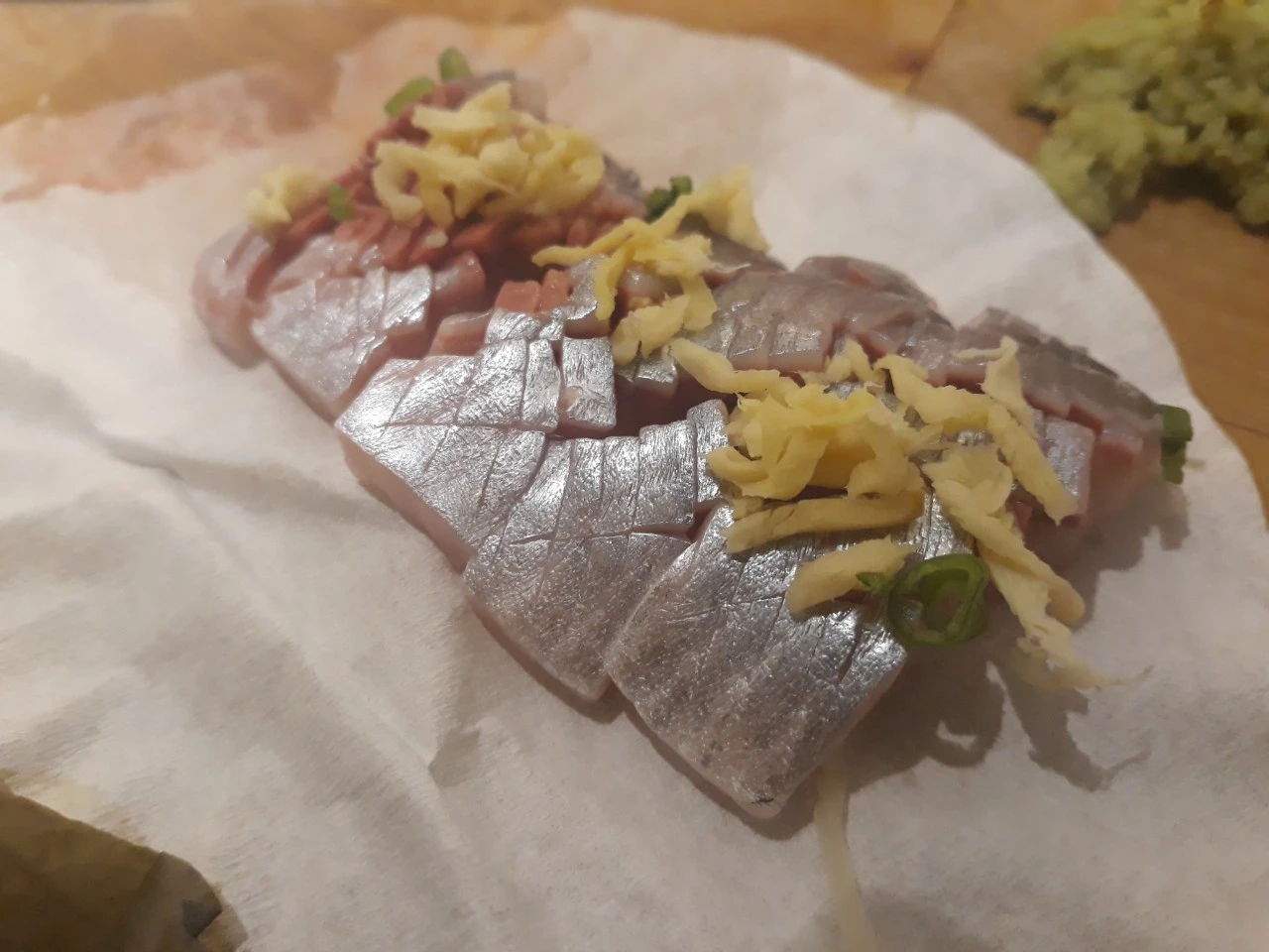 조심스럽게 써는 참다랑어. 이어서 청어가 나오자 나는 내심 환호를 질렀다. 겨울에 암스테르담 길에서 양파와 곁들여 파는 아랭이라고 불리는 그놈, 신선한 기억으로 남아 있다. 청어는 알 배기 전인 지금이 제일 맛있을 때란다. 청어 자투리로 만든 청어 다다끼. 다다끼에 곁들이기 안성맞춤인 진정한 슈도(술도둑)이라 불리는 귀한 참치 내장젓 가리비살과 가리비에 붙은 식감이 쫄깃한 오투 살까지.