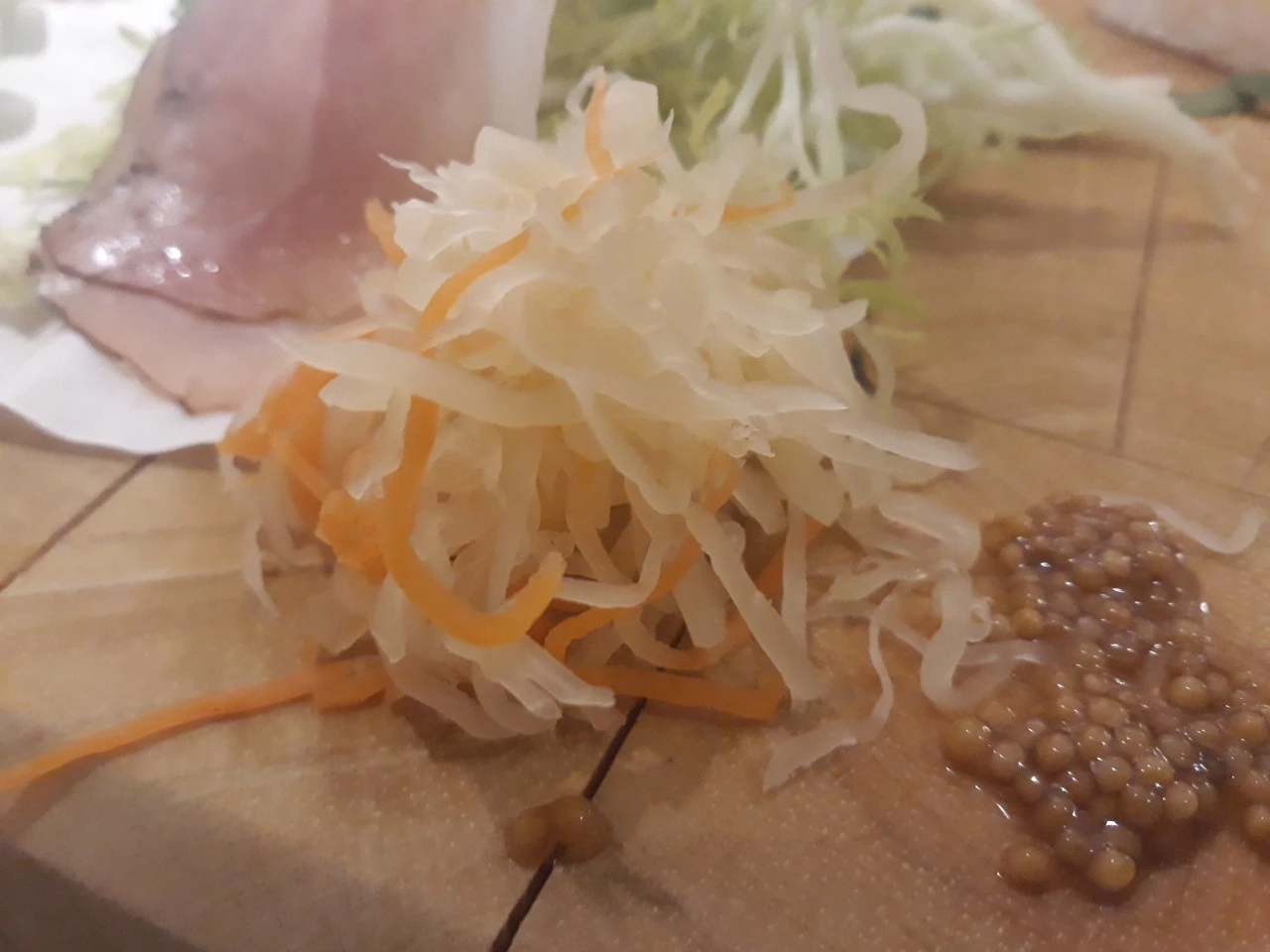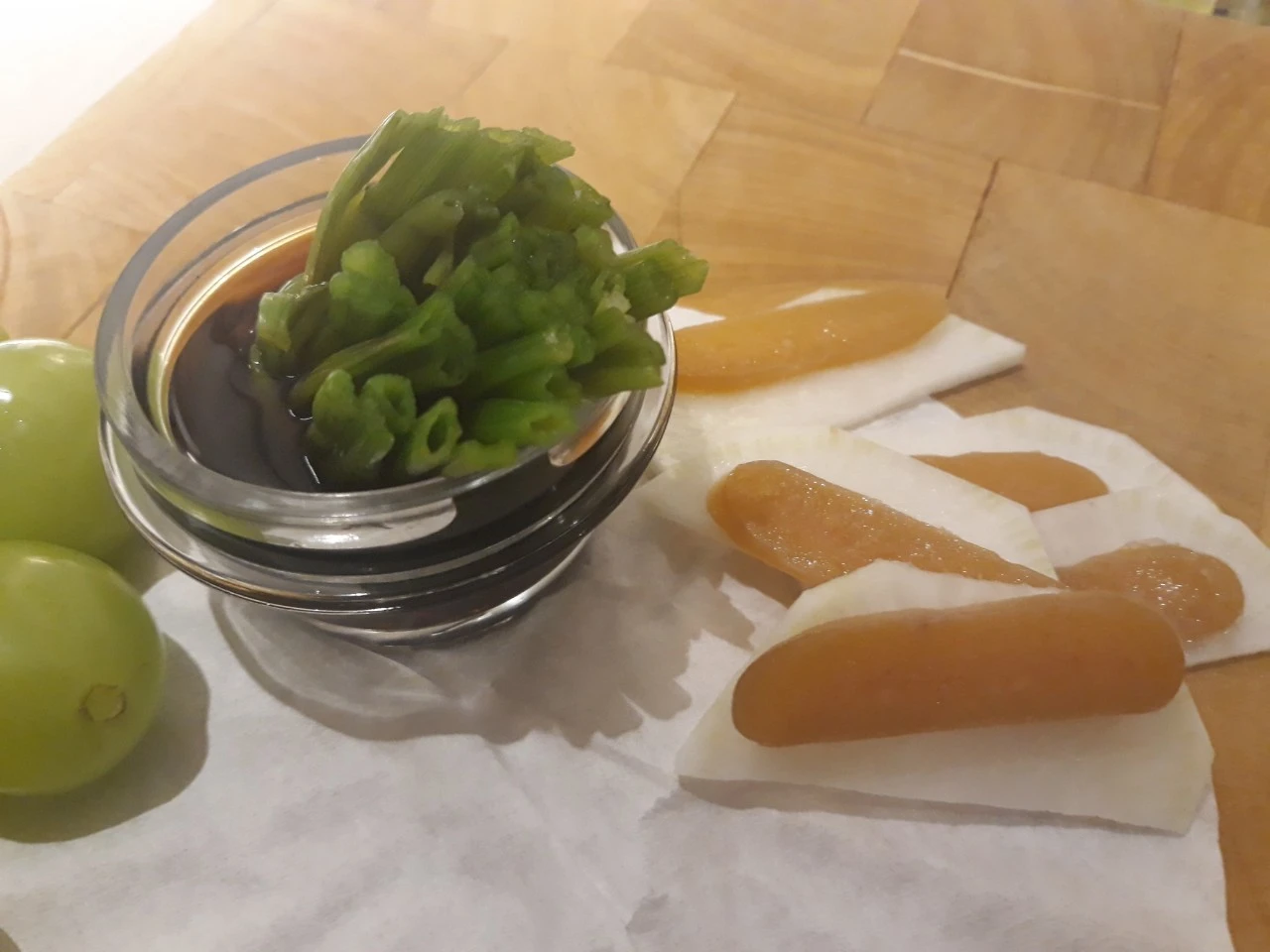 회 담당 남자 주방장이 자신 있게 먼저 내놓으려 써는 것이 숭어 어란이다. 참기름과 진간장 등을 오랜 기간 두고 바르며 말려야 하는 손이 많이 가는 귀한 음식이다. 물론 맛도 기막혀서 임금님 진상 품목이었다 한다. 주방장이 직접 만들었다니 자랑할 만도 하다.