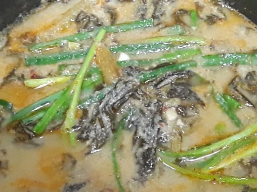 된장과 어울리는 우거지를 찾아 넣는다.