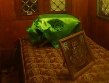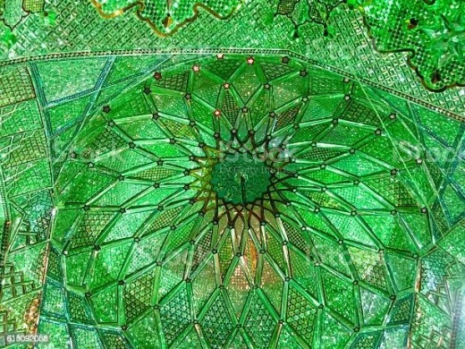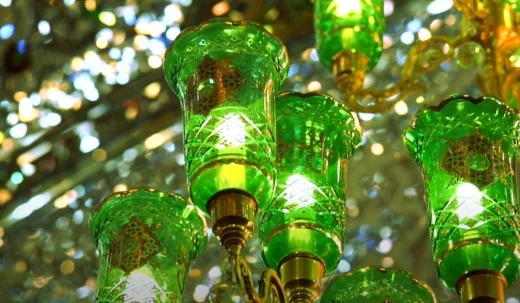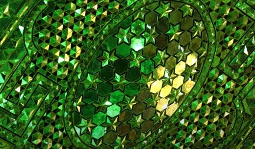 영묘의 거울 모자이크 장식에 초록 유리 등을 켠다.