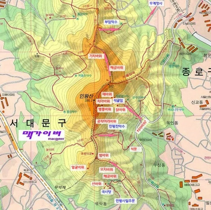 인왕산의 정상 밑 쪽에 '매바위'라는 바위가 있다.
