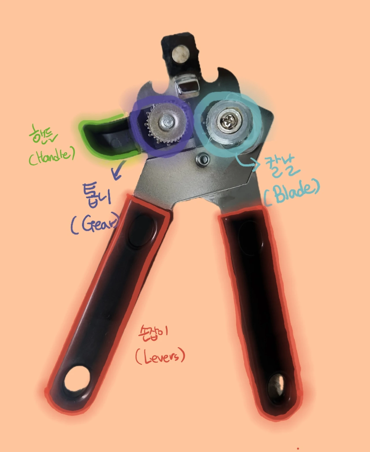 칼날 부분(Blade)이 바깥쪽으로, 톱니 부분(Gear)을 안쪽으로 해서 꾸욱 눌러주면, '푸슝' 바람이 빠지는 소리와 함께 흠이 생기고 그대로 손잡이(Levers)를 잡고 핸들을 돌리면 된다.