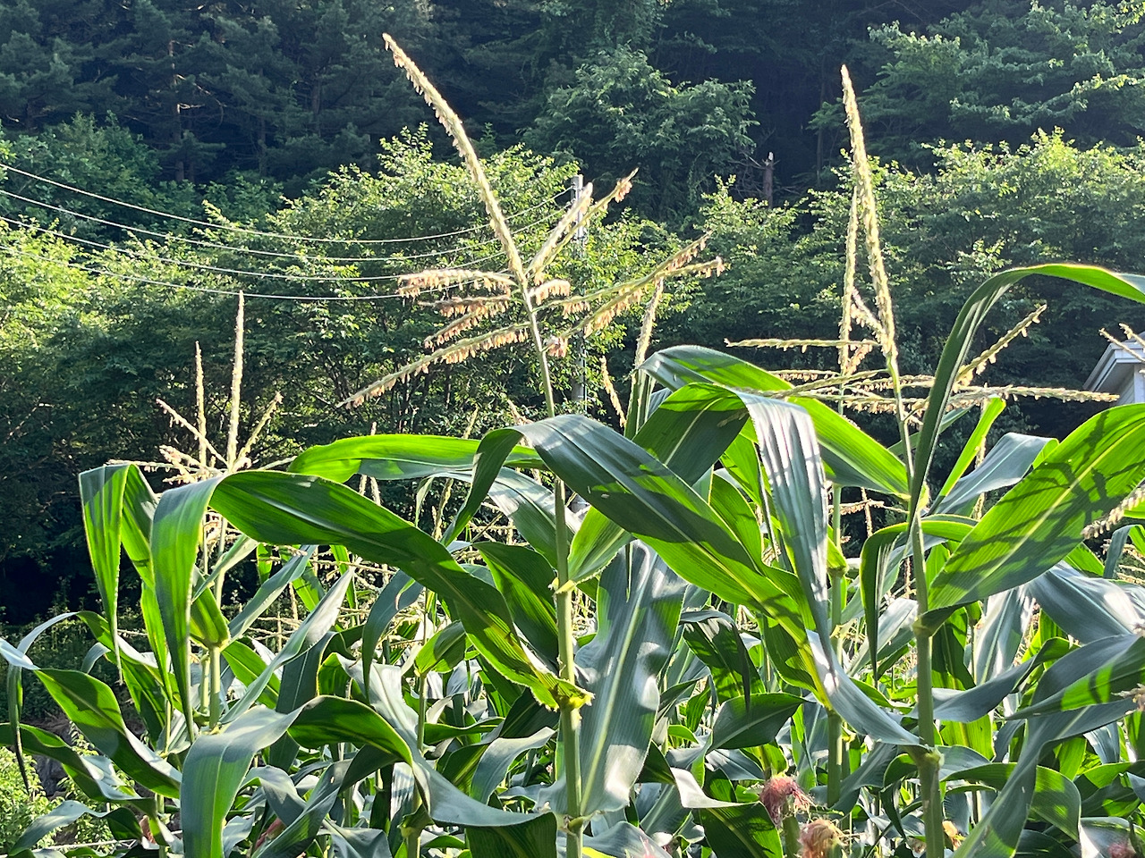 옥수수는 한 대에서 암수가 나오는데 대 끝에서 나오는, 통상 개꼬리라고 불리는 놈이 수꽃이다. 삐죽삐죽 머리카락 같은 꽃에 수분이 매달려있다. 암꽃은 옥수수에 달린 옥수수수염이다. 개꼬리에서 수분이 떨어져 암꽃인 옥수수수염에 떨어지면 수정이 이뤄져 옥수수알이 찬다. 옥수수수염 하나가 옥수수 한 알이 된다니 신기하다.