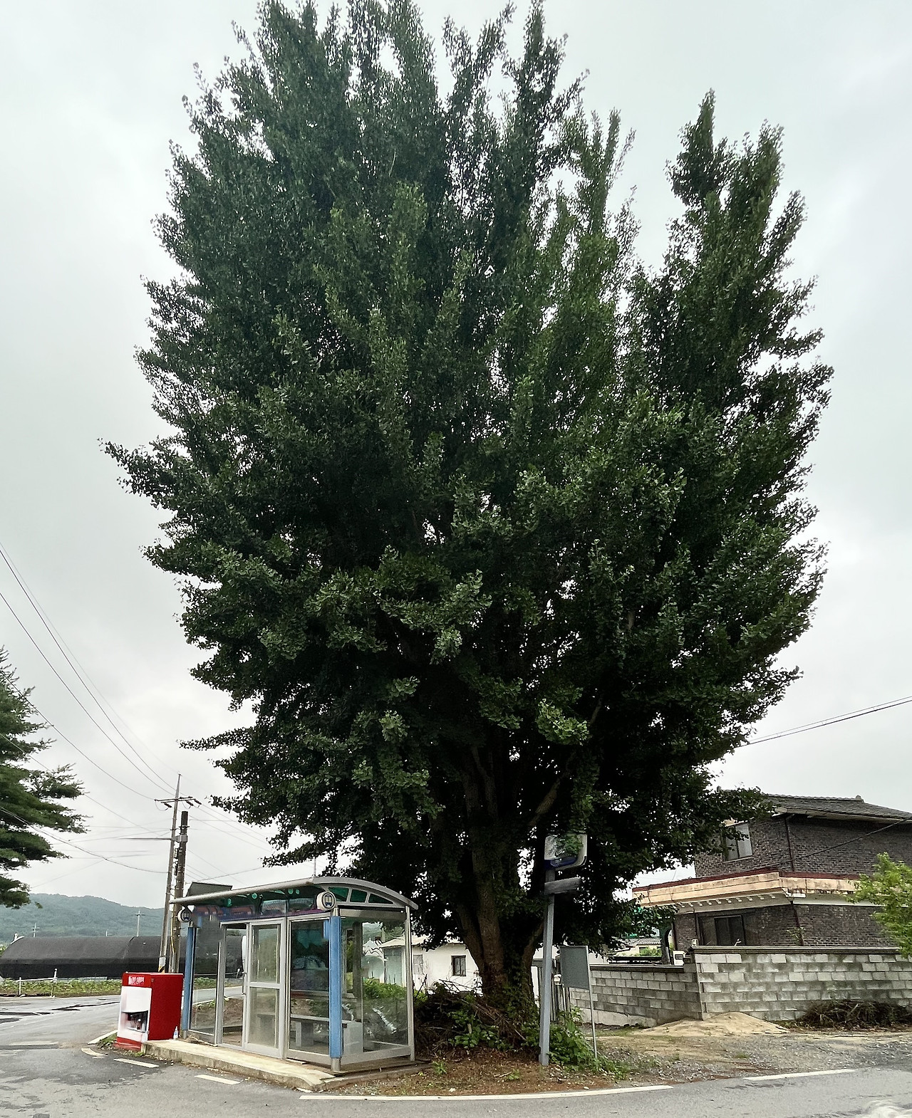 버스 정류장 삼거리에 서있는 수나무 은행나무. 사진=김효원