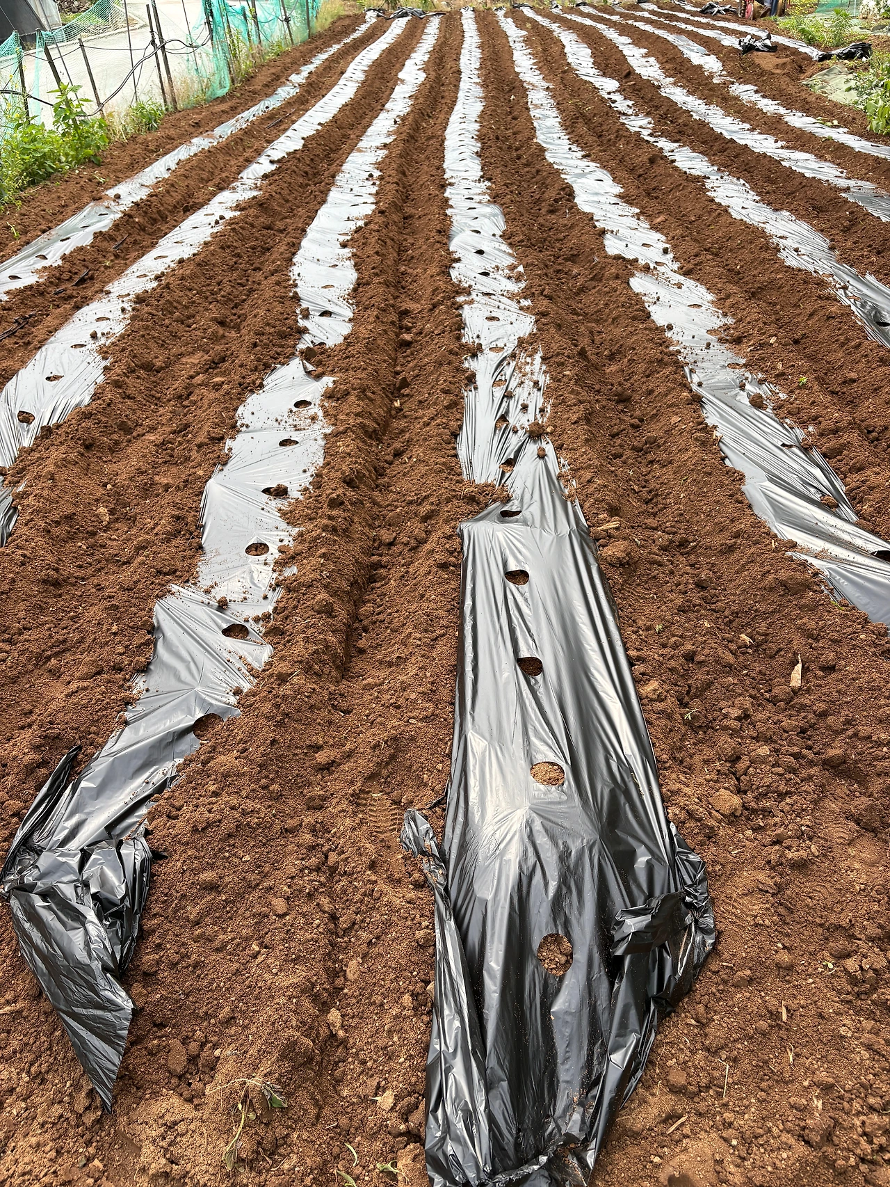 텃밭에 제초매트를 다 깔려면 그 비용 또한 만만치 않아서 재활용을 선택했다. 마을 한편에 설치된 쓰레기장에는 농사에 쓰이고 버려진 비닐이며 제초매트 등 농사 쓰레기가 산더미처럼 쌓여있다. 그중에 비교적 멀쩡한 제초매트를 가져다가 텃밭에 꼼꼼히 깔았다. 엄밀히 말하자면 제초매트는 아니고 다른 용도인 것 같았으나 알 길이