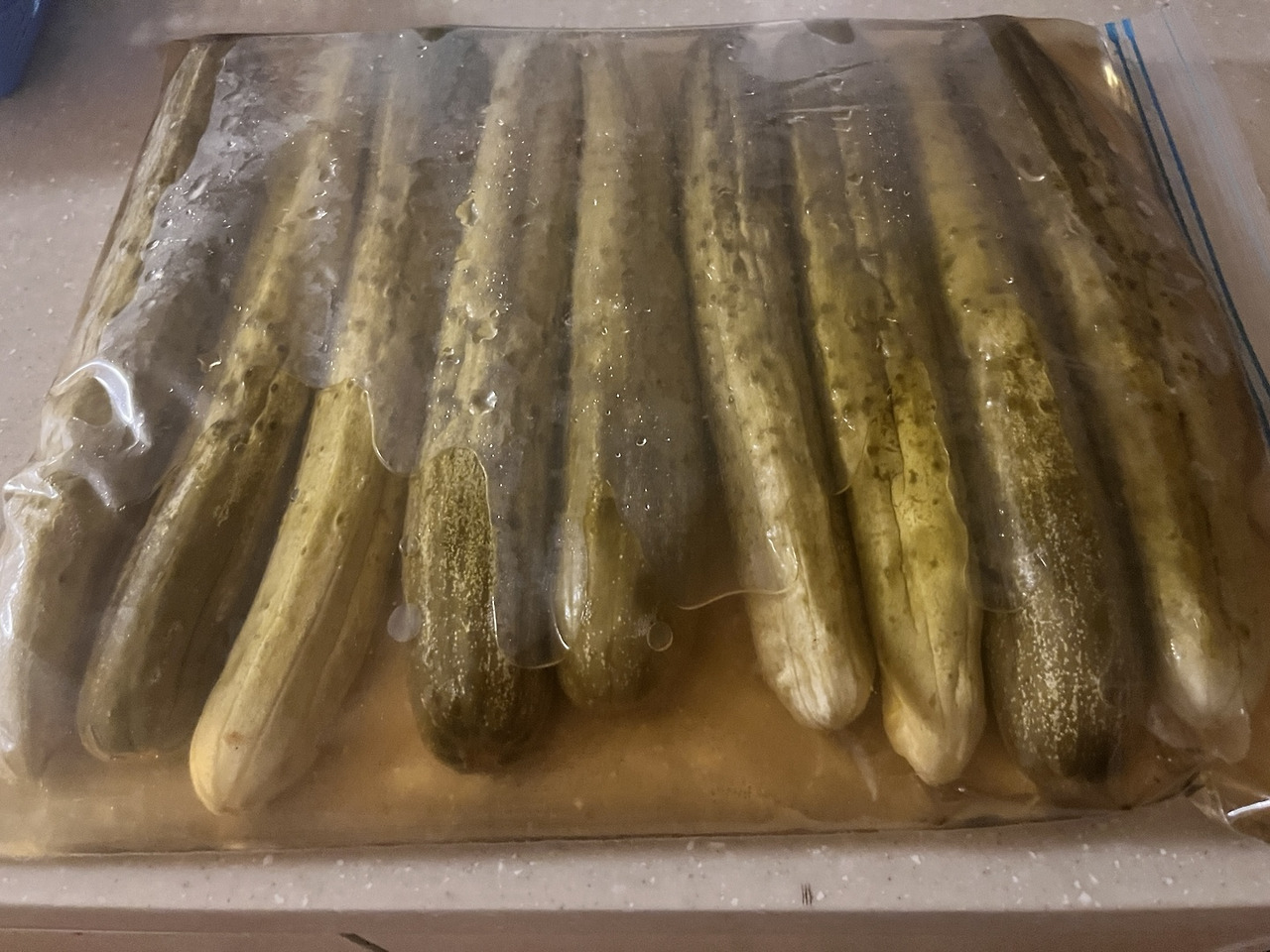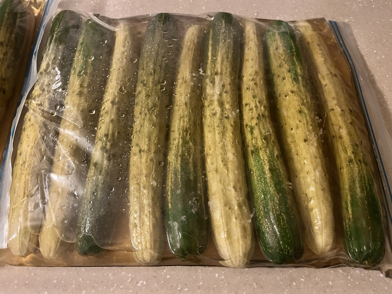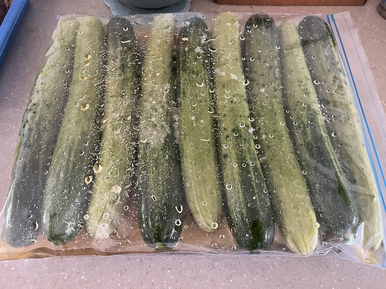 오이가 아홉 개쯤 들어가는 큼직한 지퍼백에 오이를 넣고 소금, 설탕, 식초, 소주를 부은 다음 지퍼를 닫고 납작하게 눕혀 놓는다. 오이 10개에 소금 반컵, 설탕 1컵, 식초 1컵, 소주 반컵을 넣으면 된다.