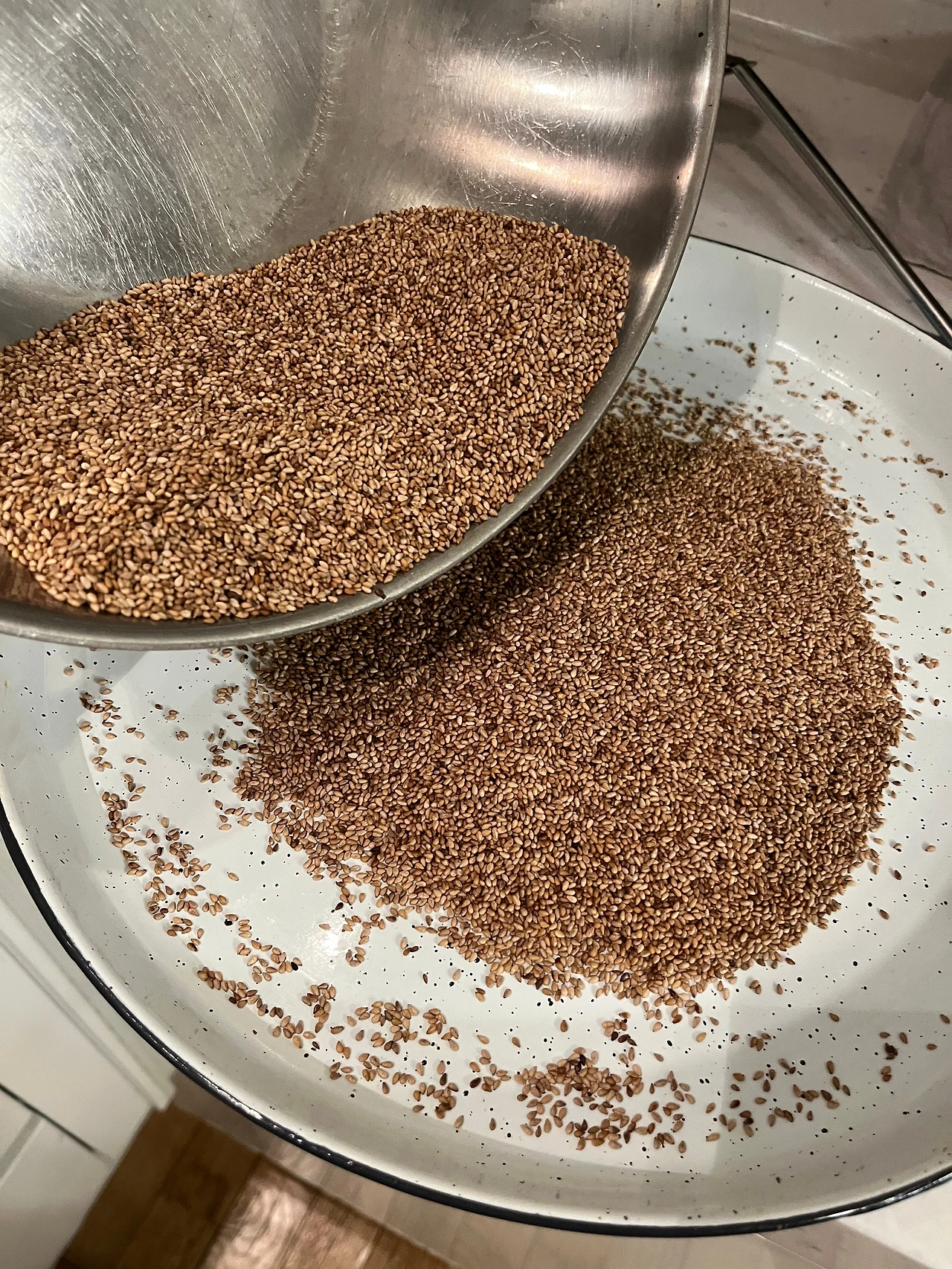 참깨를 까불러 티끌을 더 날렸고, 먼지 같은 걸 없애기 위해 참깨를 물에 씻어 건진 후 채반에 올려 건조하는 과정을 거쳤다. 깨를 물에 담그면 먼지와 티끌이 물에 뜬다. 또 알이 덜 차 가벼운 참깨도 물에 뜨기 때문에 알이 꽉 찬 참깨만 남길 수 있다.