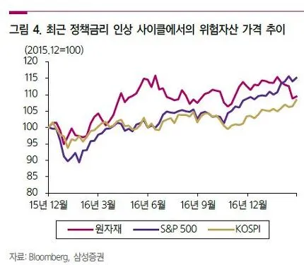 먼저 한미 금리 역전으로 인한 자본유출 우려부터 살펴보겠다. 99년 6월-2001년 3월, 2005년 8월-2007년 8월 한미간 금리가 역전된 사례가 있었으며 두 경우 모두 한국은행은 미국 기준금리 인상에 발맞추어 금리를 올렸다. 따라서 가계부채가 쌓인 상황에서 금리가 올라가면 한국 경제에 부정적일 것이라는 주장의 존재는 인정된다.