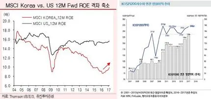 또한 2014년 이 후 지속 상승하고 있는 코스피 200의 영업이익과 최근 회복중인 MSCI 한국 지수의 예상 ROE를 고려한다면 본 시장의 회복은 실로 명약관화(明若觀火) 하다고 할 수 있다.