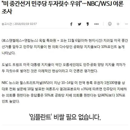 (관련기사: 미 중간선거 민주당 두자릿수 우위 NBC&WSJ 여론조사(2018년 3월 19일)