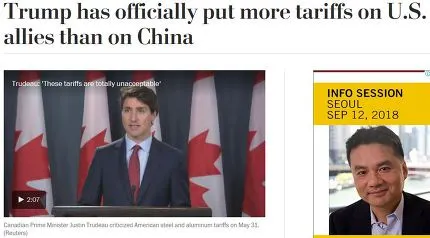 (관련 기사: Trump has officially put more tariffs on U.S. allies than on China(2018년 5월 31일)