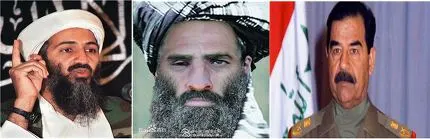 <왼쪽부터 레이건 정권의 지원으로 성장한 오사마 빈 라덴, 물라 오마르, 사담 후세인>