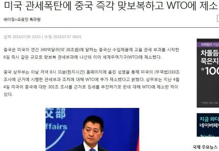 (관련기사: 미국 관세폭탄에 중국 즉각 맞 보복하고 WTO에 제소(2018년 7월 7일)