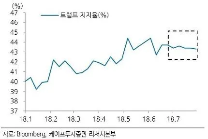 그러나 트럼프 정부의 지지율 상승에도 불구하고, 트럼프의 승리를 이끌었던 러스트벨트와 팜벨트의 지지율은 하락 중이다. 이는 트럼프 행정부가 무역전쟁을 장기적으로 수행할 수 있는 동력이 점점 떨어지고 있음을 의미한다.