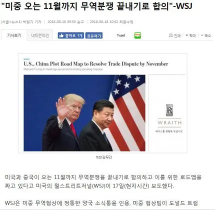 (관련 기사: "미중 오는 11월까지 무역분쟁 끝내기로 합의"-WSJ(2018년 8월 18일)