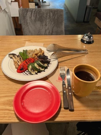 아메리카노가 먼저 나왔다. 지난겨울, 그가 내게 쥐어줬던 핫팩처럼 따스한 머그잔을 그러쥐었다. 식당 벽에는 먼저 방문한 사람들의 메모가 잔뜩 붙어있었다. 사랑을 약속하는 이, 직장동료와 우정을 다지는 이, 탄생의 축복을 기다리는 이... 고운 색연필도 잔뜩 놓여있었는데, 홀로 온 사람이 남긴 것은 없어 보였다. 모두 나처럼 곁눈질로 훑다가 가는 것일까? 얼마 지나지 않아 모둠 채소 구이가 나왔고, 나는 제법 고상한 사람인 양, 채소를 조금씩 앞접시에 덜어와 나이프로 썰어 한 조각씩 입에 넣었다. 역시나 많이 먹지는 못했지만, 채소 하나하나 맛을 즐길 수 있어 슬그머니 기분이 좋았다.