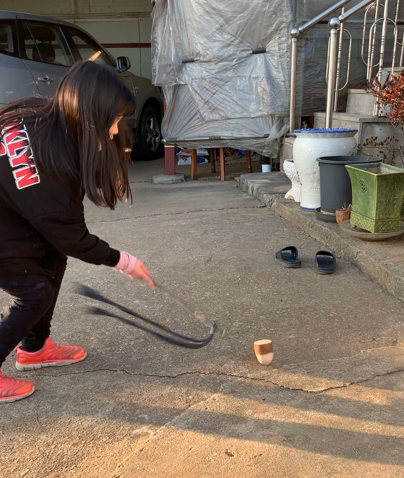 팽이를 완성한 후 집안에 들어가니 두 딸은 텔레비전을 보고 있다. “자, 팽이치기 할 사람~!”하고 부르니 첫째는 만화영화에 빠져서 쳐다보지도 않는다. 아직 텔레비전에 그리 흥미를 느끼지 않는 둘째가 “저요~!” 하고 대답한다. 이제 막 일곱살이 된 녀석이 팽이치기를 할 수 있을지 모르겠으나 그래도 일단 마당으로 나왔다. 음~ 역시 아직은 무리다. 둘째에게 팽이치는 아저씨 모습을 모여줬다. ㅡㅡ;
