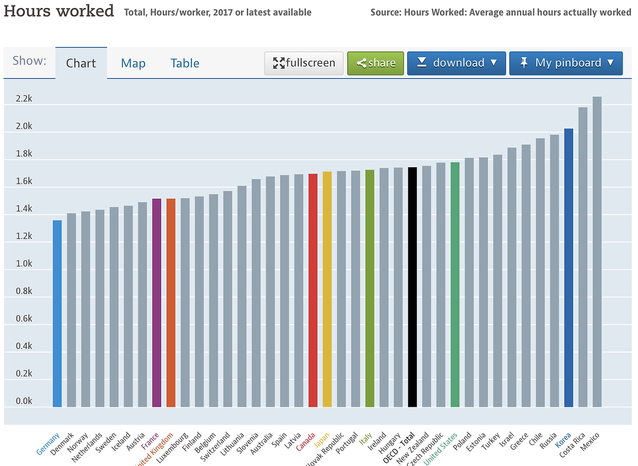 [OECD국가들을 대상으로 하는 노동자당 연간 노동 시간 자료를 보니 대한민국은 여전히 최상위권! 역시 노동의 나라인가! 일자리를 얻은 사람들은 일하느라(실제로 일하는 시간인지는 모르겠지만) 힘들고 한편에선 일자리를 구하지 못해 힘들고. 걍 간단하게 사람들 더 뽑고 월급 조금씩 나눠서 주면 좋겠구만...이기적인 심성을 가진 인간들이 고렇게는 못하겠지? 암튼 일하는 시간을 마냥 늘린다고 해서 생산성이 높아지는 것은 절대 아님은 진리라 생각한다. Steve Glaveski(Collective Campus 설립자)씨는 하버드 비즈니스 리뷰에 쓴 글에서 1일 6시간 노동을 제안한다. 내가 살아 있는 동안 그럴 날이 올랑가 모르겠지만 이 방향이 옳아 보인다. 인공지능, 로봇 등이 주인공이 될 가까운 미래를 생각하면 더욱 더 옳은 방향인 것 같다.]