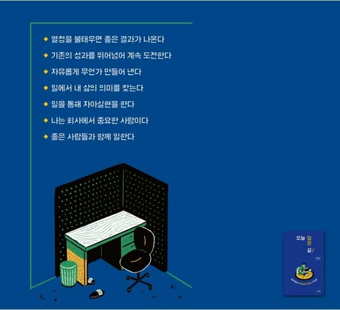 폴커 키츠는 몇몇 예외적인 사례들로 포장되어 온 직장생활의 환상들을 걷어내고 ‘일’에 대해 좀 더 현실적으로 접근하자고 말합니다. 아마도 많은 직장인들이 직장생활에 대한 환상과 현실의 불일치를 경험하고 있을 것입니다. 직장생활을 말할 때 포장된 환상들을 저자는 아래 일곱가지로 정리했습니다. 평소 제가 접하던 말들과 상당히 유사합니다.