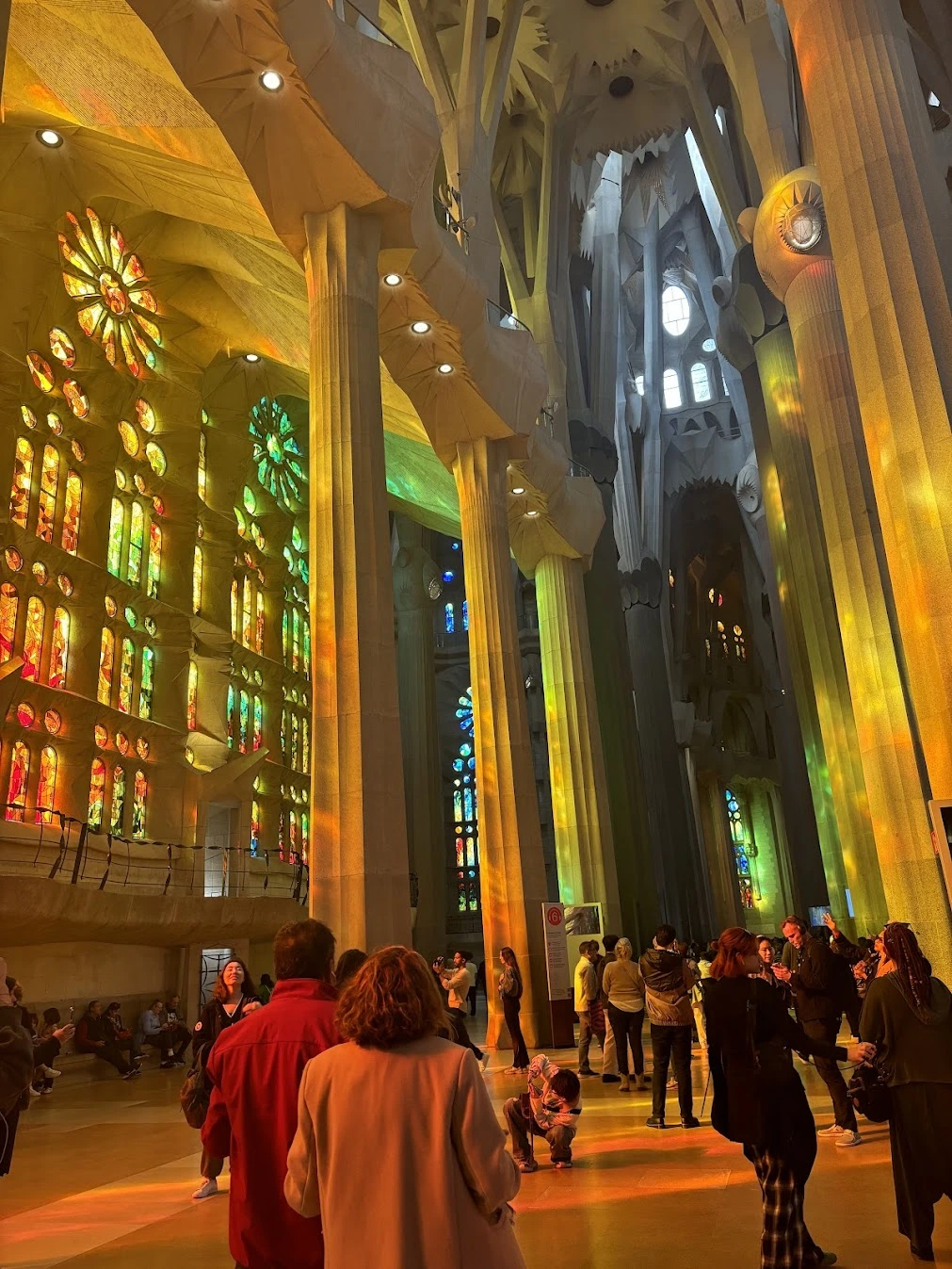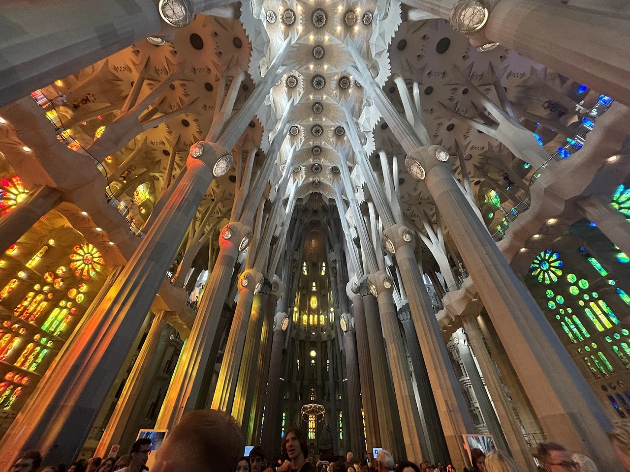 다운받은 가이드 앱으로 짧은 해설을 보았다. 가우디는 이곳을 숲으로 상정했다고 한다. 이런 곳에서 급하게 다운로드 받아 뇌에 덕지덕지 칠하는 지식이란 금세 흘러가버리기 마련이지만. 그 중에도 내가 이 장소를 이해할 때 머리에 길게 남는 잔상이 있다. 사그라다 파밀라아는 숲이었다. 기둥이 마치 나무처럼, 세로로 결을 띈 곡선의 형태로 허리를 뻗어 여러 겹의 가지를 치고 있다. 가지 끝은 뾰족한 방사형의 이파리가 끝없이 이어지고 네 겹을 넘는 높은 나무의 열과 세로로 길게 뻗은 행에서 그런 모습이 이어진다. 양 옆의 벽에서 무지개색 빛이 스테인드 글라스에 투과되어 지금까지 보았던 어떤 무지개보다도 사방을 가득 채우며 내리쬐고 있다. 그 빛이 나무에 걸리지 않고 바닥의 폭에 반사되어 공간을 채운다.