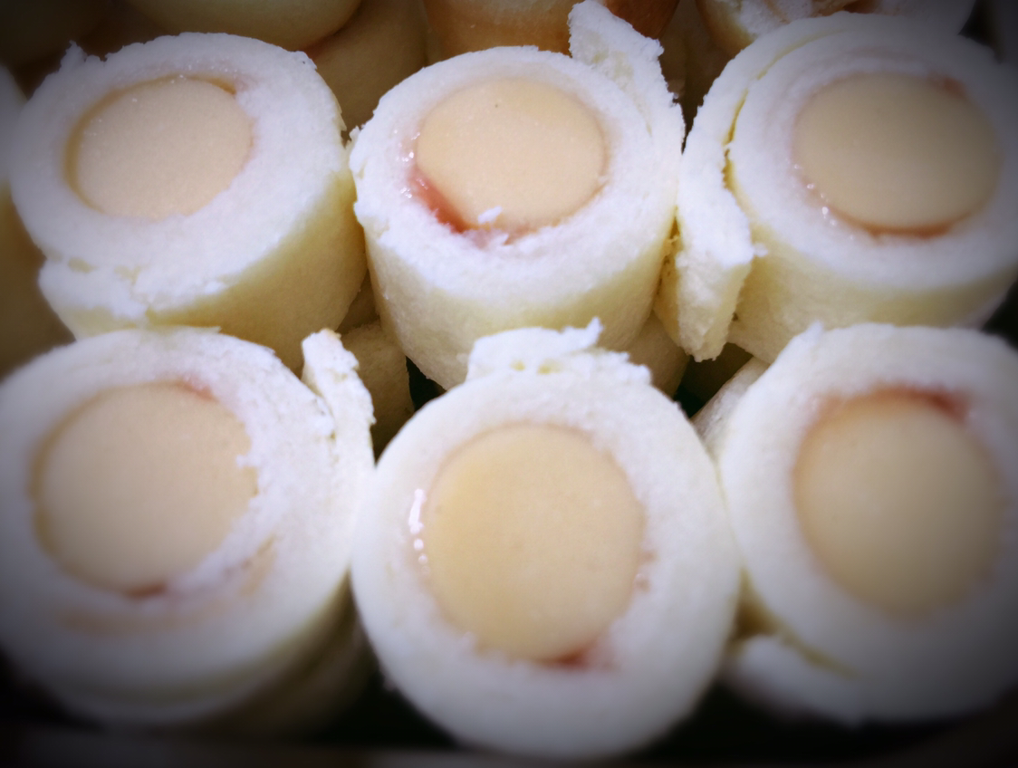 그 위에 작은 소시지 또는 슬라이스 햄, 또는 상온에서 잠깐 놔 둔 슬라이스 치즈를 넣는다.