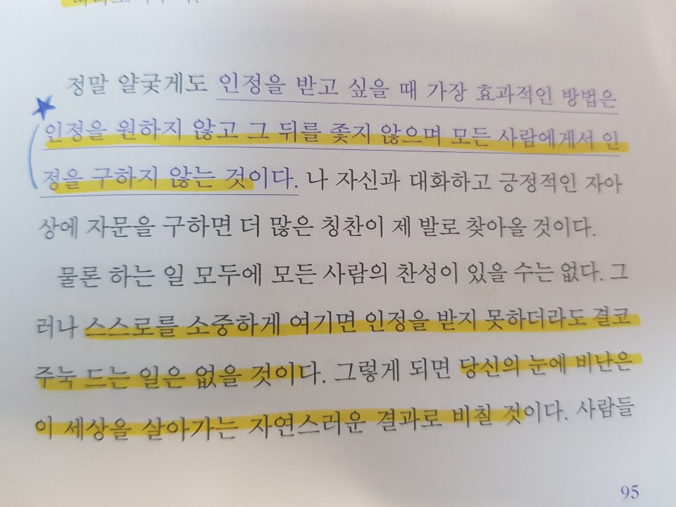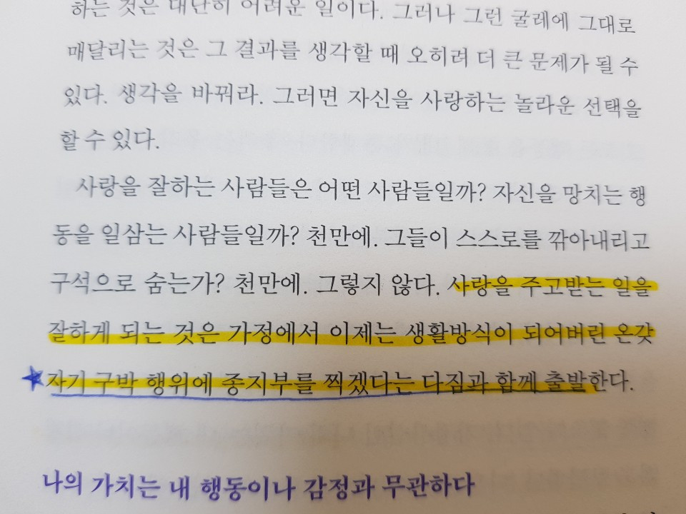 -다른 사람의 생각, 말, 행동과 내 가치 사이의 연결고리를 끊을 것. 비난에 부딪혔을 때 자신에게 이렇게 말해보라. "이건 그 사람의 문제야." , "내 저렇게 나올 줄 알았어. 하지만 나하고는 상관 없는 일이야."