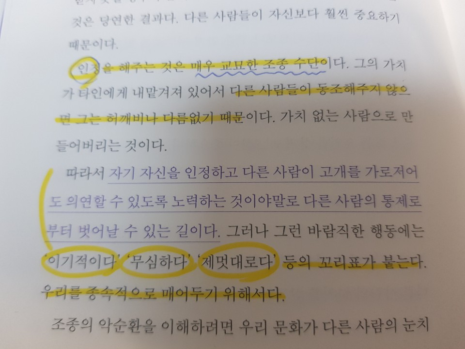 -말을 할 때나 무언가를 사고 싶을 때 또는 어떤 일을 할 때 자기 인생에서 중요하다고 생각하는 사람의 허락을 받는다. 그 사람이 화를 낼까 두려워서다.(<-화를 낼까 두려워선지는 모르겠지만 허락을 받는다 자주)