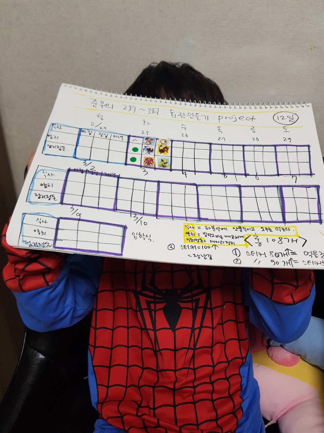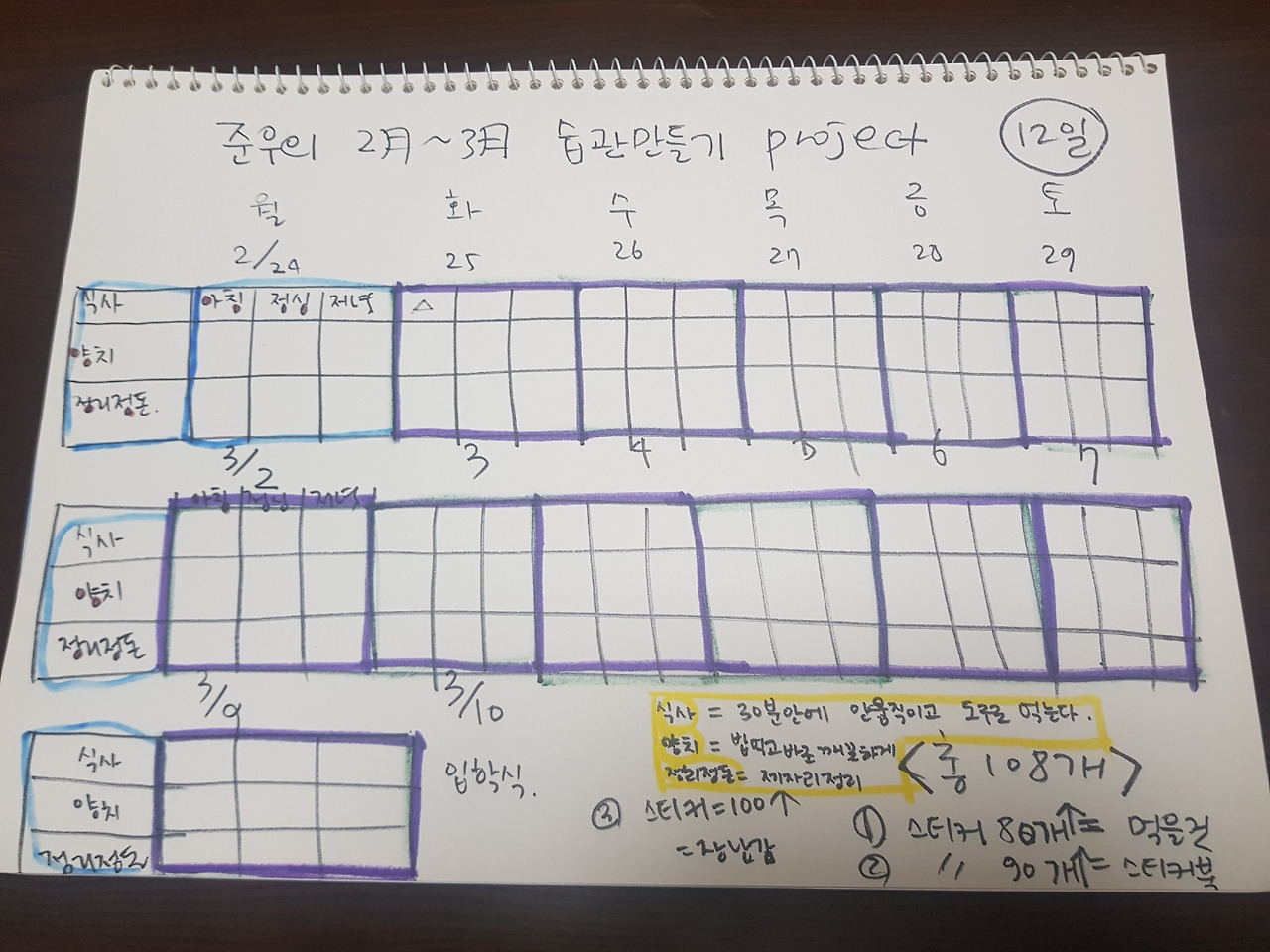 평소 기본적인 습관이 잘 안 되기에 늘 실랑이를 벌였는데, 2주간 함께 해야 하니.... 내가 화병 오지 않기 위해 잔머리를 굴렸다. 다행스럽게도 첫날은 통한 것 같구나.ㅎㅎㅎㅎ