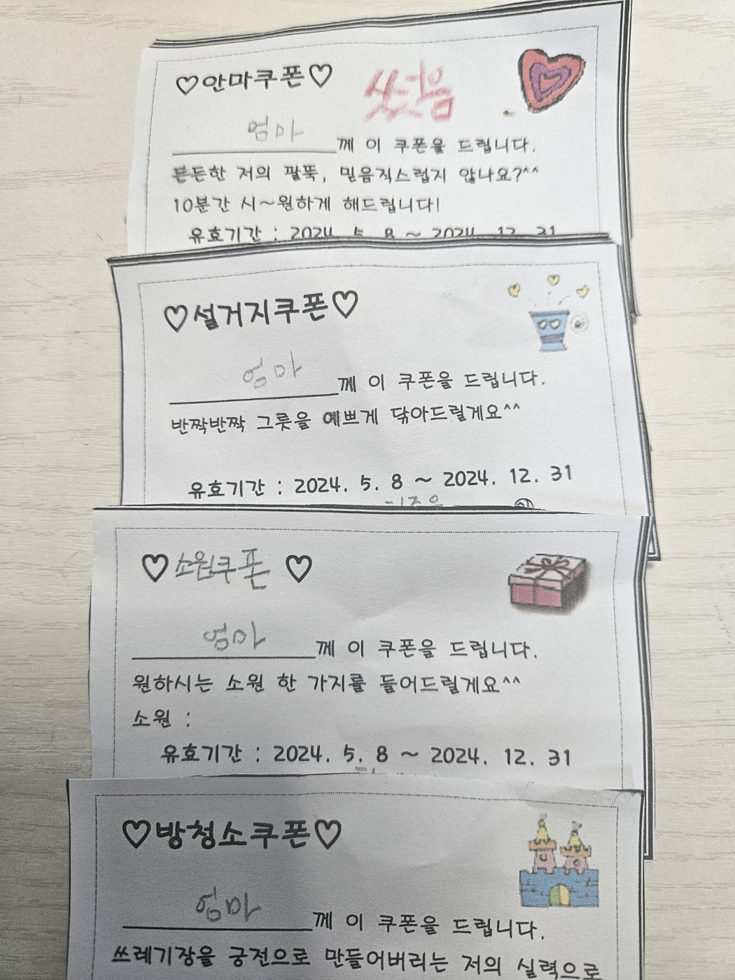 [사진설명_아들이 준 쿠폰과 카네이션 꽃]