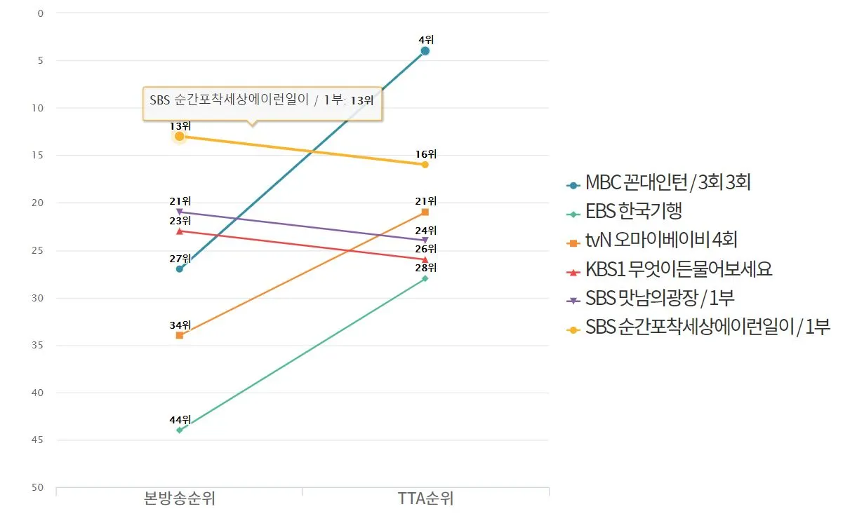아래는 본방 시철률 순위와 전체 TTA 순위를 비교 분석 한 차트 이다 흥미롭게도 본방에서는 시청률이 쳐지지만 전체 통합 데이타로는 오히려 역전을 보이고 있는 콘텐츠 들이 있다..