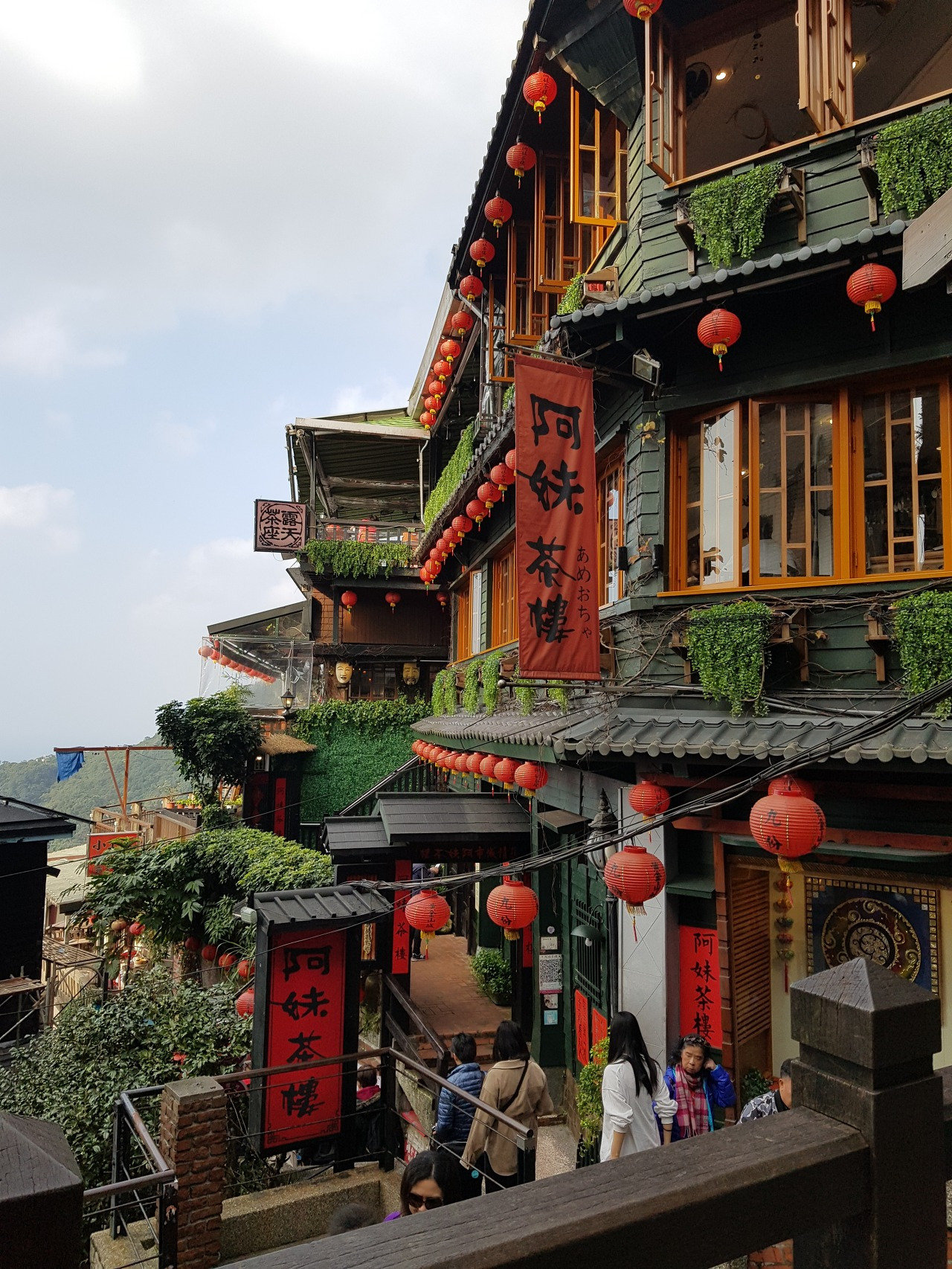 지우펀에서 관광객이 가장 많은 지산지에(基山街)는 그 당시에도 사람들이 많이 모이는 거리였다. 해가 지고 어두워지면 주민들이 이곳에 모여들어 ‘暗街(암가)’라고 불렸다 한다. 지금의 지산지에에서는 바다를 내려다볼 수 있는 전망대, 전통 일본식 건축인 ‘지우 쭝 띵(九重町) 객잔'(이름에서 이미 일본의 향기가 넘친다)이 유명하다.
