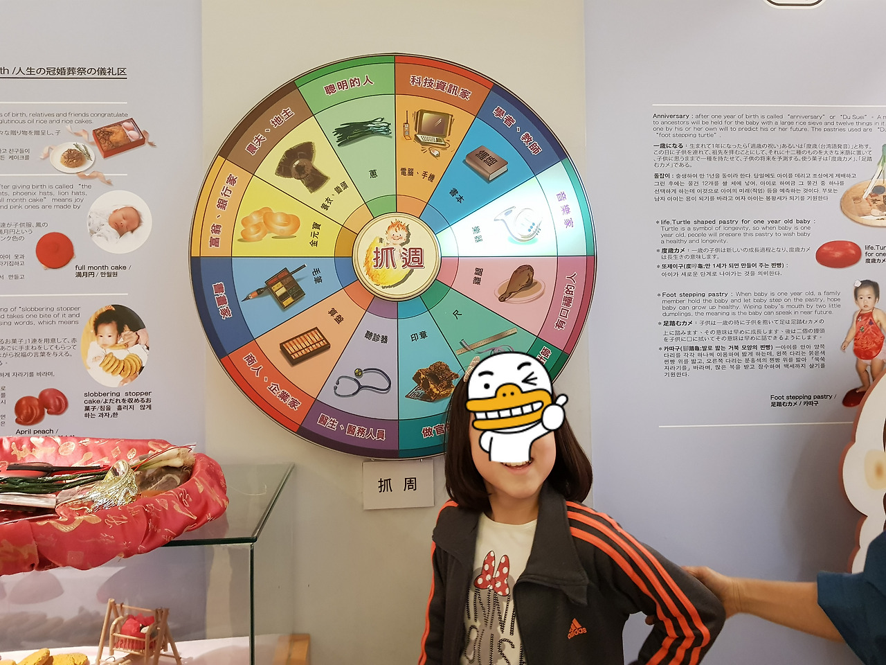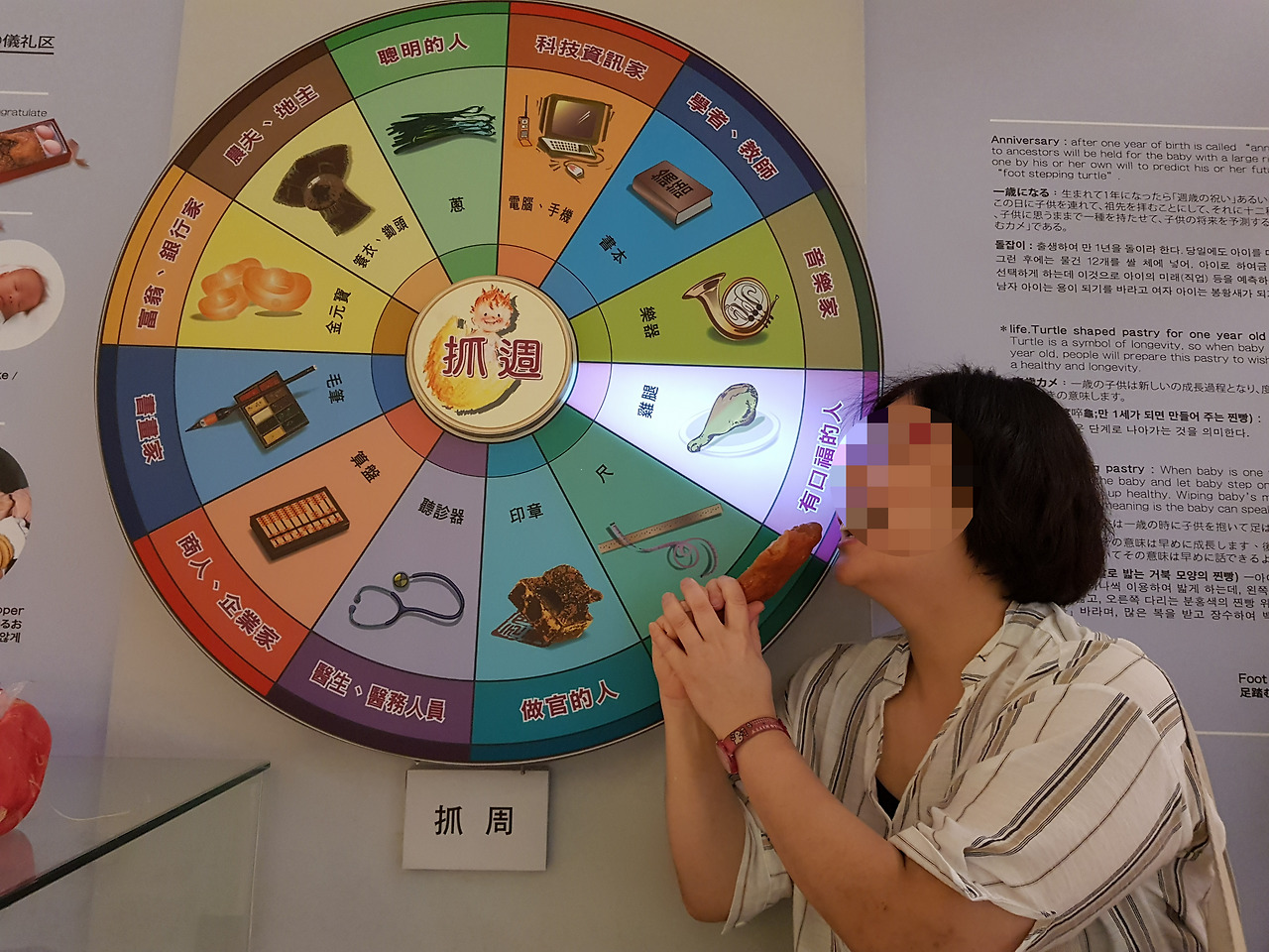 돌잡이 풍습을 소개하는 코너에서 강사가 “여러분 모두 이미 돌은 훨씬 지났지만 한 번씩 체험해 보세요.”라고 권하여 딸아이와 나도 돌잡이를 해 보았다. 청진기는 의사를, 주판은 경제력을 상징한다는 것을 알기에 전통 방식의 돌잡이는 의미가 없었다. 그래서 이 전시관에서는 참가자가 직접 물건을 잡는 것이 아니라 돌림판을 돌려 자신의 운명을 점치는 방식으로 진행하고 있었다.