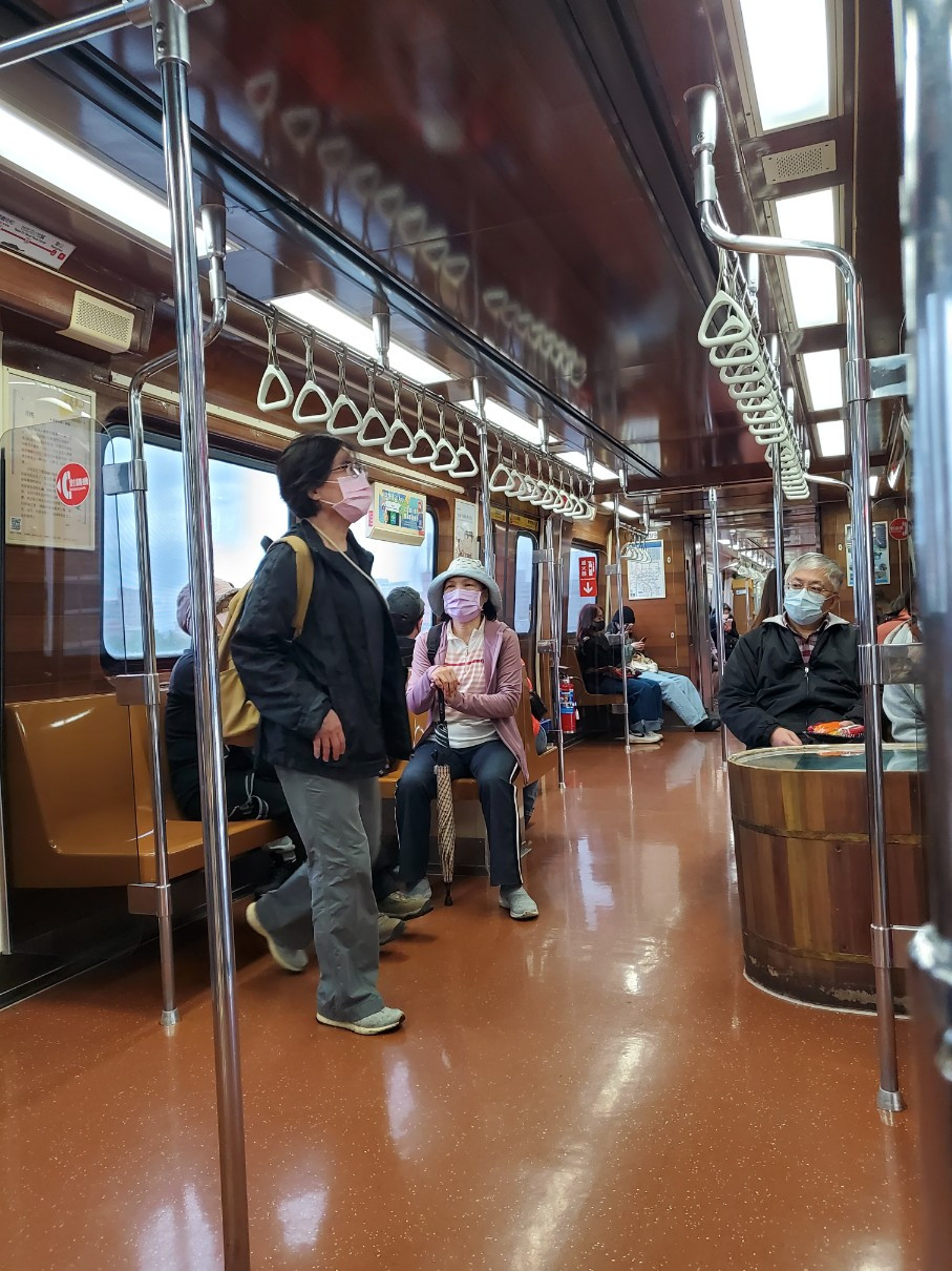 타이베이로 돌아가기 위해 신베이터우 역에서 베이터우 역까지 한 정거장 운영하는 전철을 탔더니 온천 콘셉트의 실내가 재미있다.