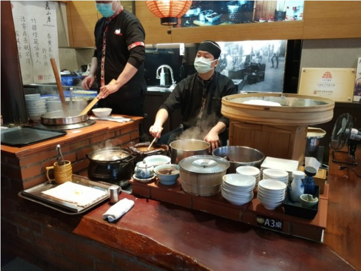 가게는 당시의 분위기를 재현해 놓고 있다. 식당 홀 내부에 위 사진과 같이 초기 전통 주방 모습을 현대식으로 재현해 만들어 놓고 여기서 단자이미엔을 만들어낸다. 재미있고 독특하고 신선하다. 손님이 앉는 의자는 등받이가 없는데, 이 또한 당시에 왼쪽 사진처럼 낮은 의자에 걸터앉아 먹는 모습을 재현하기 위한 것이다.