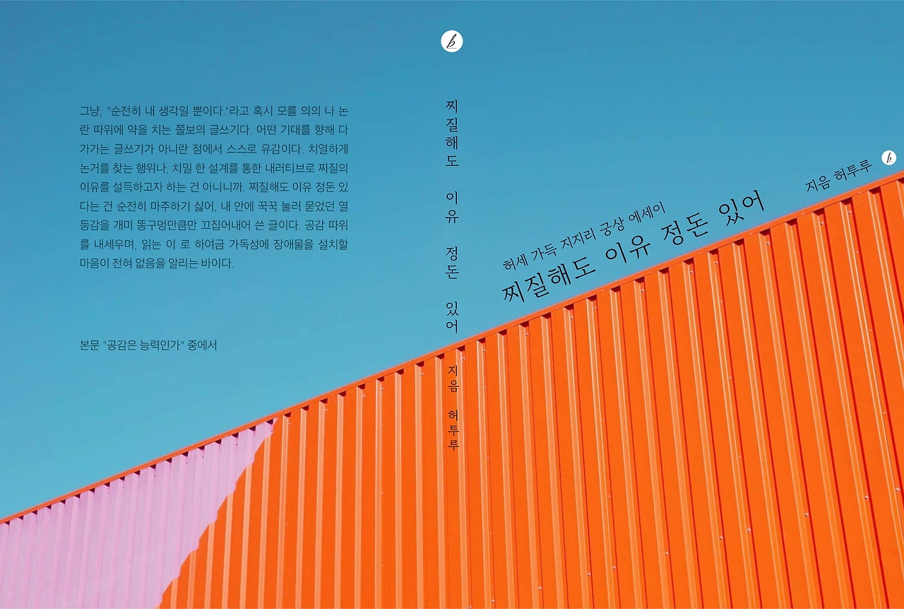 컨테이너 그림은 단지, 색감이 좋아서 가져와 보았다. '찌질'이나' 이유' 그 어떤 것과 연관 없이 단순하게 오로지 색만 보았다. 오히려 처음 표지 디자인을 하려고 마음먹었을 때, 심플 심플 곧 죽어도 심플이었다. 가장 그 결심과 어울리는 표지가 아닌가 생각하지만, “찌질해도 이유 정돈 있어” 에세이와는 상징성이 부족한 건 인지하지만, 크게 신경 쓰이지 않는다. 애써 쿨한 척!!!