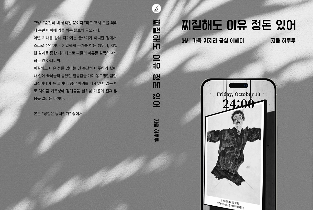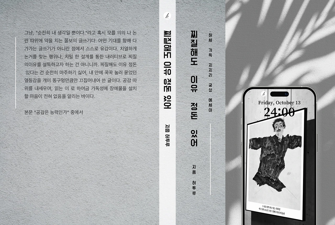 찌질한 이유에 대한 우울감과 어울릴만한 회색 색감과 시멘트 질감. 특히 아이폰 배경화면 에곤쉴레 작품 ‘자화상’은 책의 저자 ‘지음 허투루’의 자화상인 것만 같은 싱크로율과 착각을 불러일으킨다. 하여 “찌질해도 이유 정돈 있어”의 상징적 의미를 띤다.