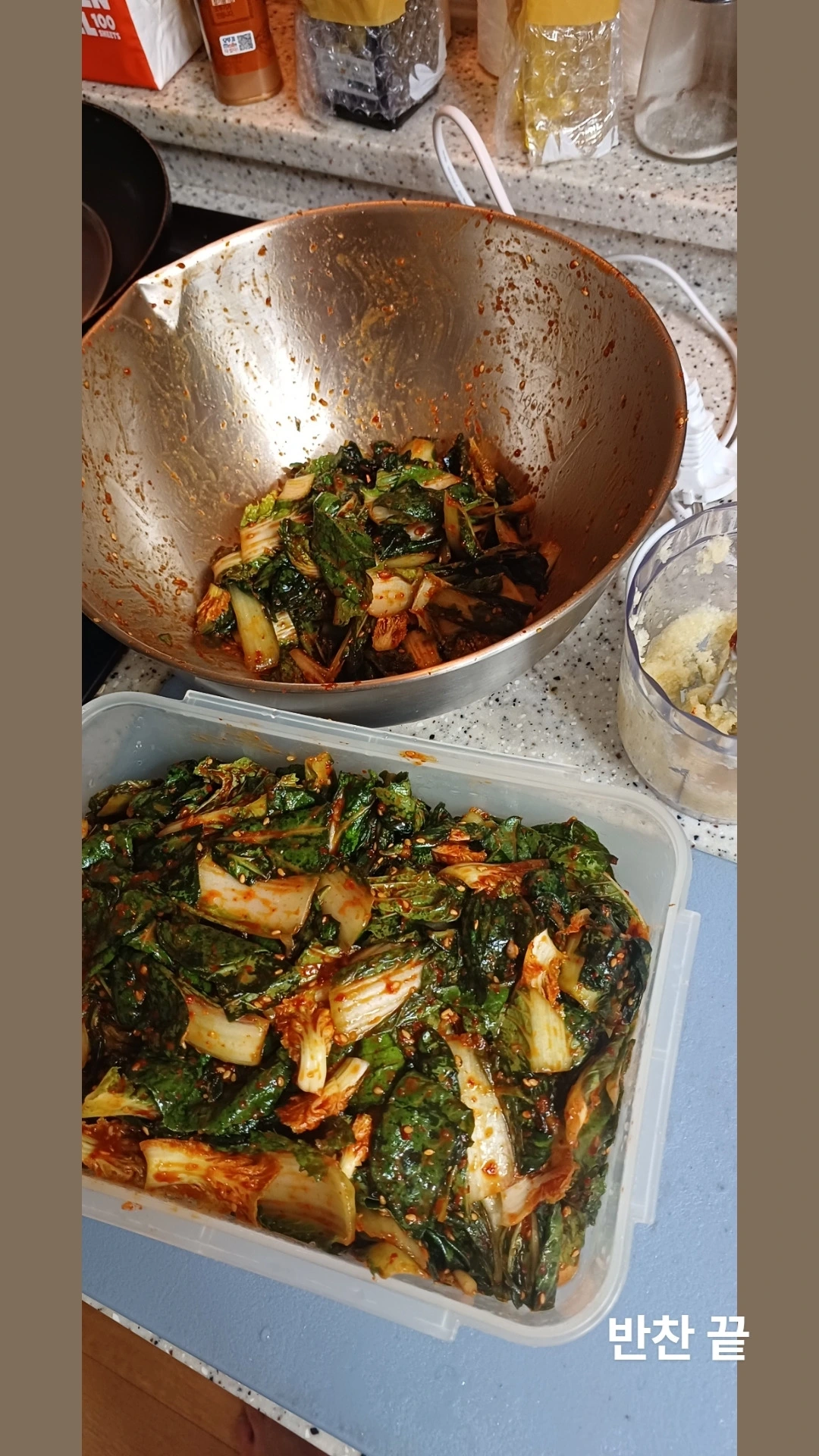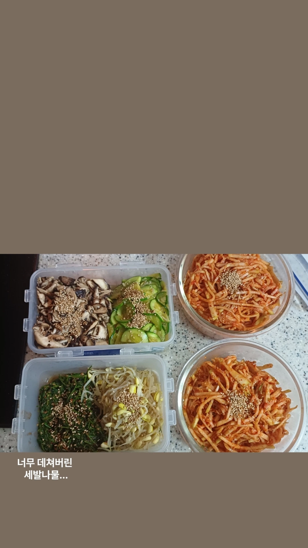 꺼내자마자 콩나물, 버섯나물, 무생채, 호박나물, 겉절이, 세발나물 총 7개의 반찬을 했다.