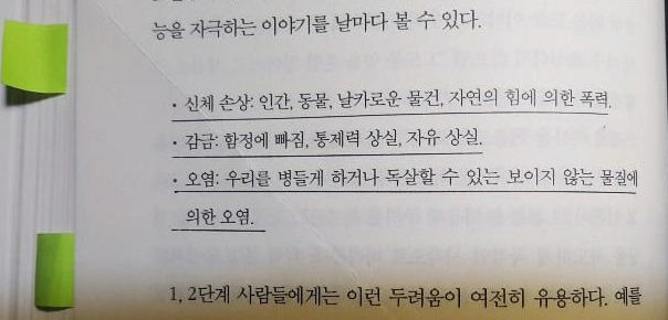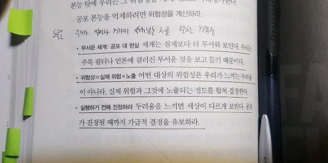 '공포'와 '위험'은 엄연히 다르다. 무서운 것은 위험해 보인다. 그러나 정말로 위험한 것에 진짜 위험 요소가 있다. 진짜 위험한 것보다 우리를 놀라게 하는 것에 지나치게 주목하면, 즉 공포에 지나치게 주목하면 우리 힘을 엉뚱한 곳에 써버릴 수도 있다./173p