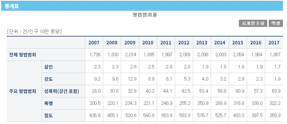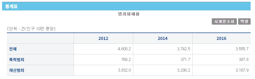 결론부터 말하자면 내 느낌이 틀렸다. 우리나라는 점점 더 안전해지고 있다. 아래 있는 2007~2017년도 사이 우리나라 범죄율 통계를 보면 주요 형법 범죄인 살인, 강도, 절도의 비율이 꾸준히 감소하는 것을 확인할 수 있다. 비록 성폭력과 폭행의 수치는 올라갔지만 이것은 이러한 범죄가 실제로 더 많이 발생한다기보다는 전에 비해 성폭력에 대한 사람들의 인식이 올라간 것 때문에 신고율이 높아졌다고 보는 편이 맞을 것 같다. 또한 아래 두 번째 통계를 보면 범죄 피해율이 2012년부터 2016년까지 감소하는 것을 확인할 수 있다.