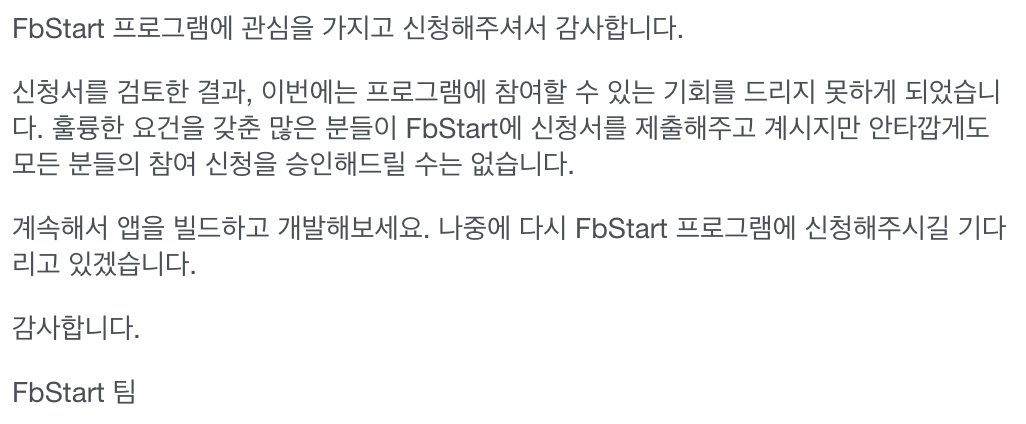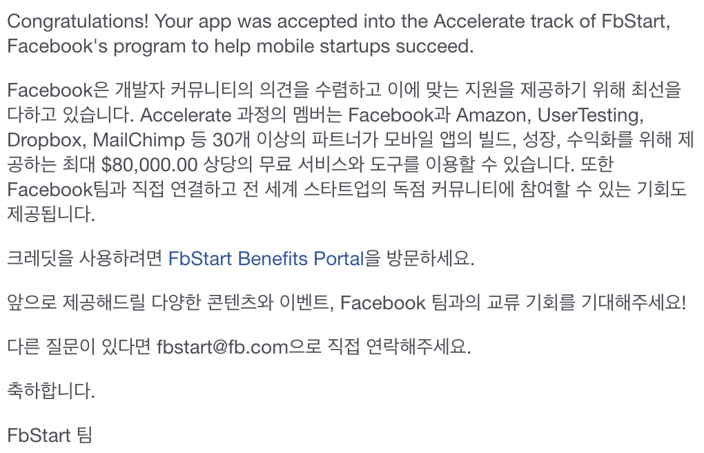 개발자의 제품 빌드와 성장을 돕기 위한 Facebook의 글로벌 스타트업 프로그램입니다. 이 프로그램에 참여하는 멤버는 무료 도구와 서비스, 지원, 교육 등을 이용할 수 있으며 일 년 내내 Facebook 팀과 직접 연결하여 기술 및 전문가 멘토십을 이용할 수 있는 기회가 있습니다. 또한 Amazon, Dropbox, Stripe, MailChimp 등 수십 개의 Facebook 파트너로부터 독점적인 맞춤 할인 패키지를 받습니다. Messenger 플랫폼 및 네이티브 모바일 앱 개발자는 FbStart.com에서 프로그램을 신청할 수 있습니다.