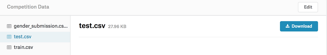 해당 탭 내에서 test.csv / train.csv 파일을 다운로드하여