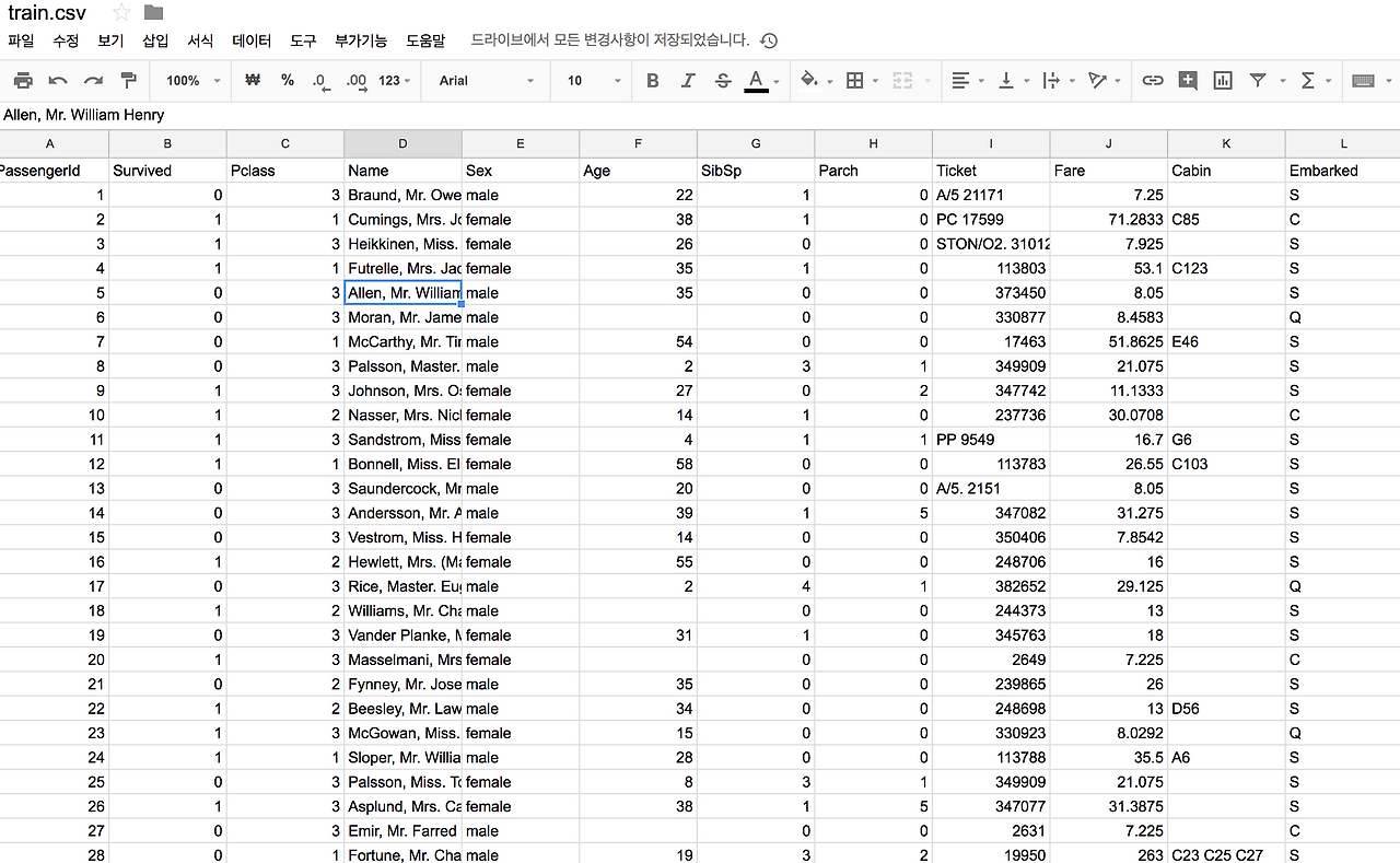 해당 데이터를 스프레드 시트에 놓고 어떻게 하면 생존율이 높았는지.